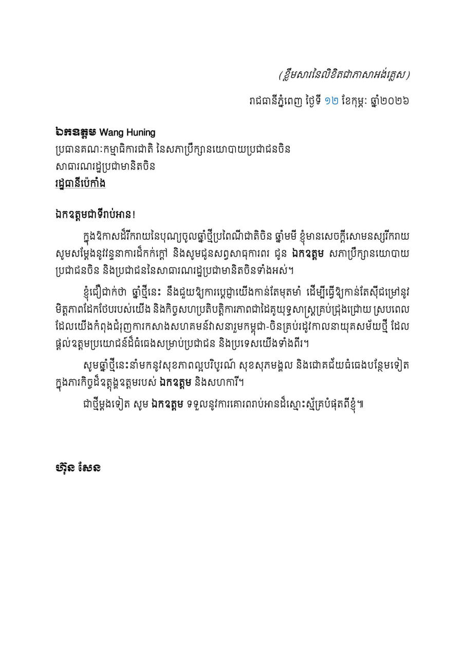 (Phnom Penh): Cambodian Senate President Hun Sen sent a congratulatory letter to Wang Huning, Chairman of the National Committee of the Chinese People’s Political Consultative Conference (CPPCC), on the joyous occasion of the Chinese New Year.