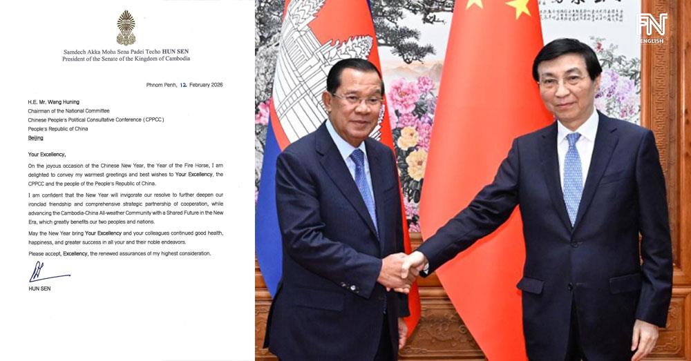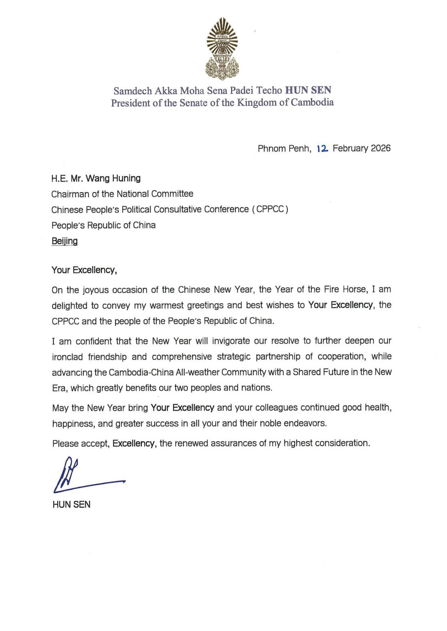 “On the joyous occasion of the Chinese New Year, the Year of the Fire Horse, I am delighted to convey my warmest greetings and best wishes to Your Excellency, the CPPCC and the people of the People’s Republic of China,” according to the letter seen by Fresh News on Thursday (Feb. 12).