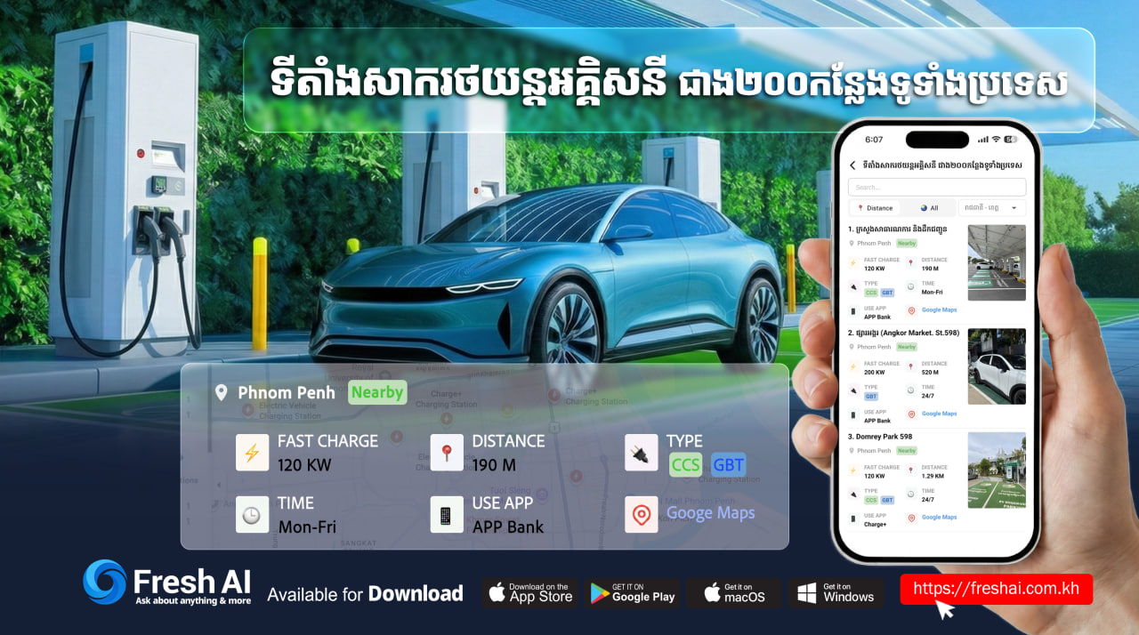 (Phnom Penh): As electric vehicle (EV) adoption accelerates across Cambodia, Fresh AI has introduced a powerful new feature called “EV Zone”, designed to help drivers instantly locate nearby EV charging stations with ease and confidence. The feature integrates more than 200 charging stations nationwide, directly connected to Google Maps. Users can quickly identify the nearest station, with real-time distance displayed in meters or kilometers from their current location.
