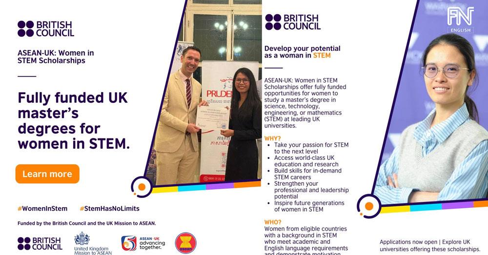 (Phnom Penh): The ASEAN-UK Women in STEM scholarship programme, co-funded by the British Council and the UK Mission to ASEAN, provides funding for one-year master’s degree courses at top ranking universities and research institutions within the UK, with the objective of increasing opportunities for women in STEM, strengthening female leadership in science and innovation, and promoting a more diverse and gender-representative STEM sector.