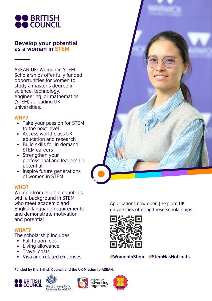 To see details of scholarships which are available in Cambodia, please visit British Council scholarships for women in STEM | British Council (https://cambodia.britishcouncil.org/british-council-scholarships-women-stem-1). Applications for ASEAN-UK Women in STEM scholarships are open until late April 2026.