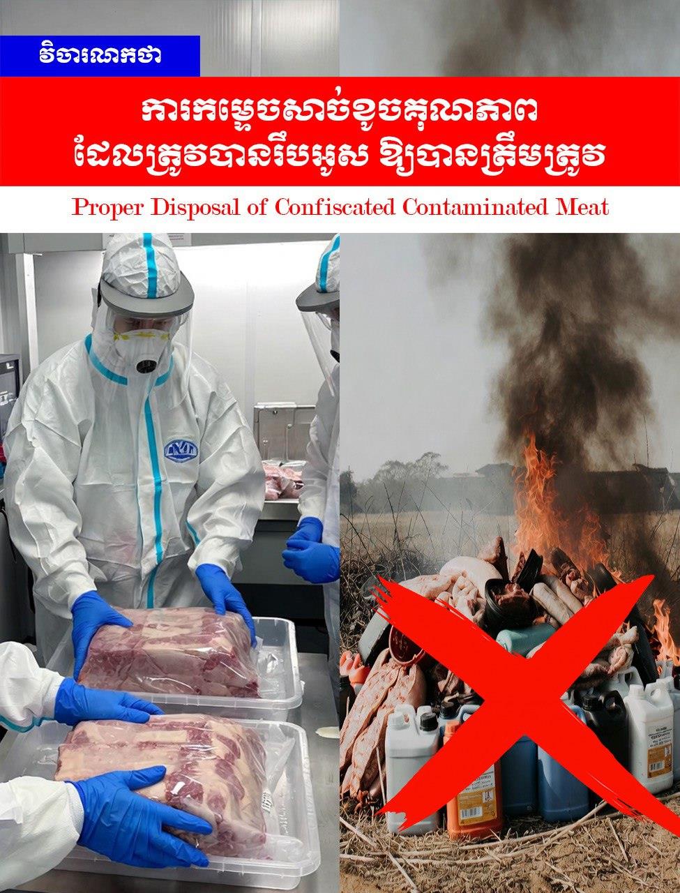 (Phnom Penh): When authorities seize meat that is contaminated or unfit for consumption, proper disposal becomes a vital public health responsibility. Unsafe meat can harbor bacteria, infectious viruses, or chemical contaminants that threaten human health, livestock, and the environment. Therefore, disposal methods must ensure that these products cannot re-enter the food chain while minimizing environmental impact.