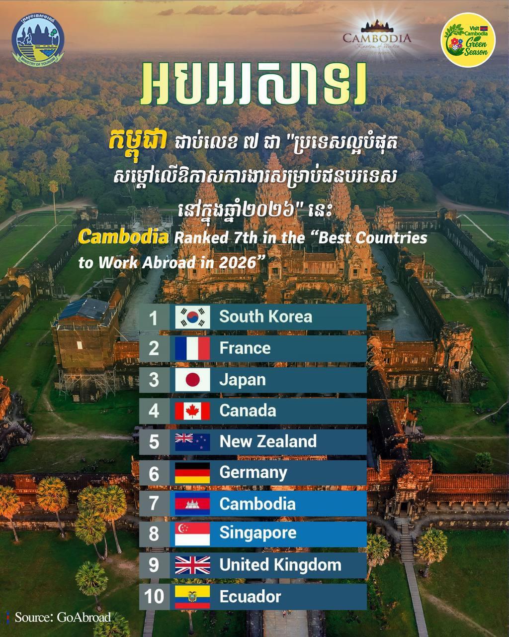 (Phnom Penh): According to GoAbroad’s 2026 rankings, Cambodia has secured 7th place globally in the list of the Best Countries to Work Abroad in 2026, making it the highest-ranked country in Southeast Asia.