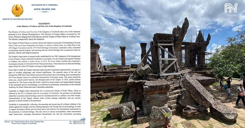 (Phnom Penh): Cambodian Culture Ministry takes note of the statement attributed to Sihasak Phuangketkeow, Thai Minister of Foreign Affairs, as reported by The Nation Thailand, alleging that Cambodia has used the temple of Preah Vihear as a military base. The ministry categorically rejects this allegation, according to a statement seen by Fresh News on Friday (Feb. 27).
