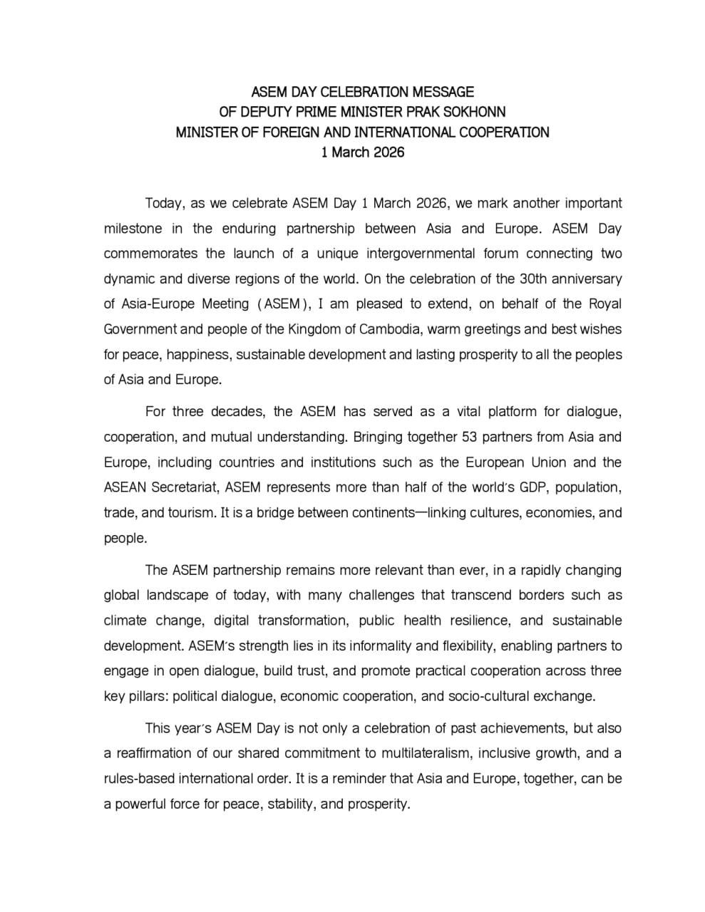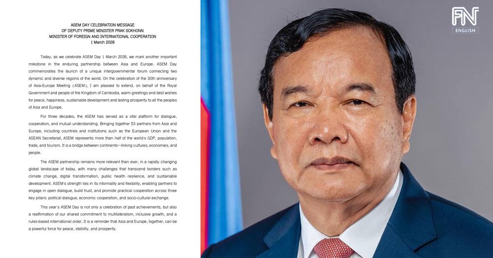 (Phnom Penh): Below is a full ASEM Day celebration message of Cambodian Foreign Minister Prak Sokhonn.