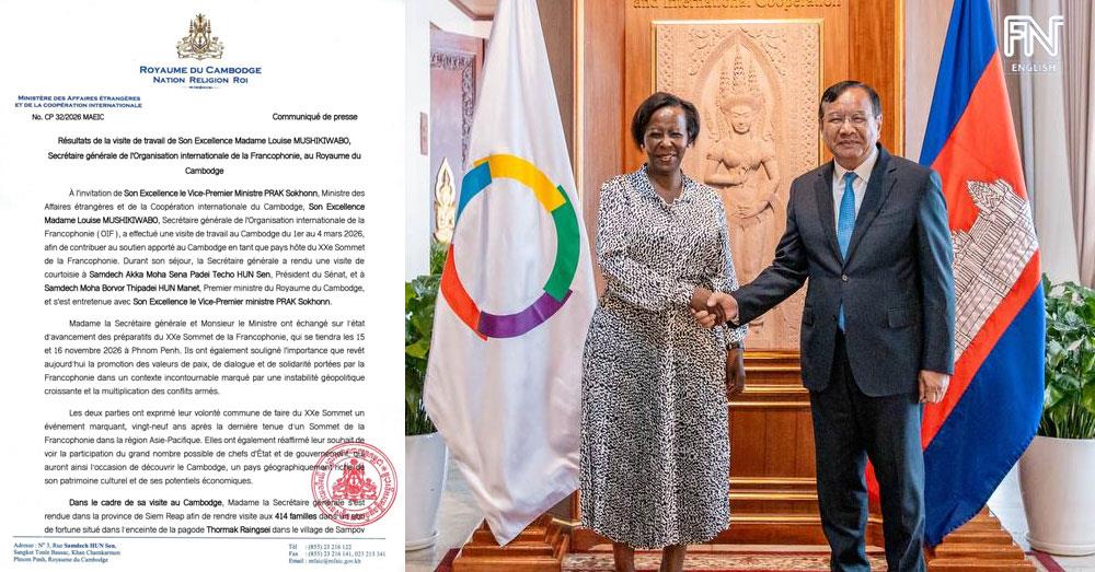 Louise Mushikiwabo, Secretary General of the International Organisation of La Francophonie (OIF), and Cambodian Foreign Minister Prak Sokhonn exchanged views on the progress of preparations for the 20th Francophonie Summit, which will be held on 15 and 16 November 2026 in Phnom Penh. They also underscored the importance of promoting the values of peace, dialogue, and solidarity upheld by the Francophonie, in the context of growing geopolitical instability and the proliferation of armed conflicts.