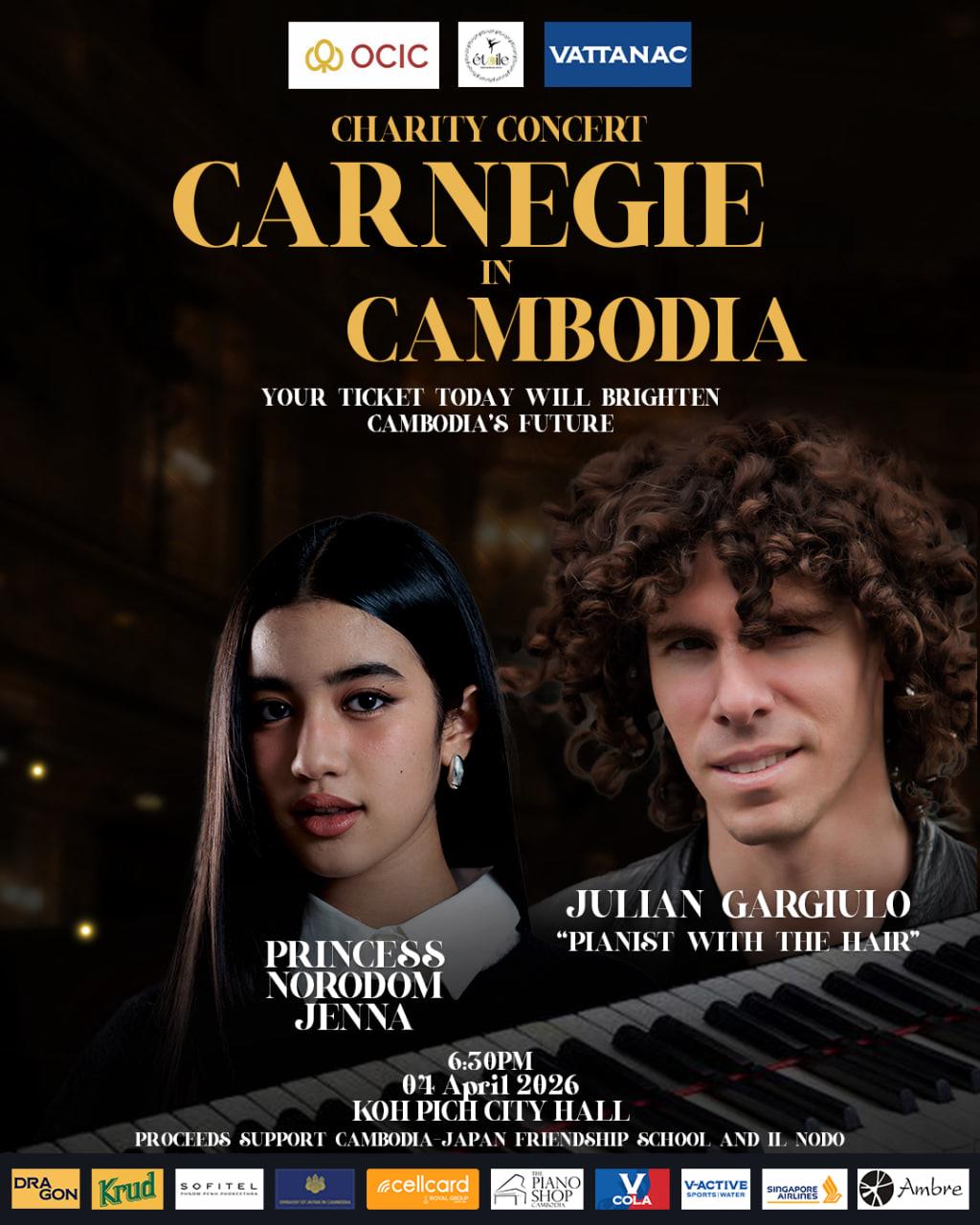 (Phnom Penh): Renowned pianist Julian Gargiulo and Cambodian singer Princess Norodom Jenna will perform in a charity concert titled "Carnegie in Cambodia" on 4 April 2026, at 6:30 p.m. at Koh Pich City Hall in Phnom Penh.