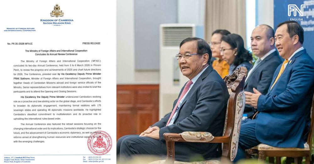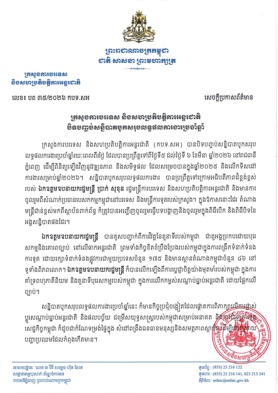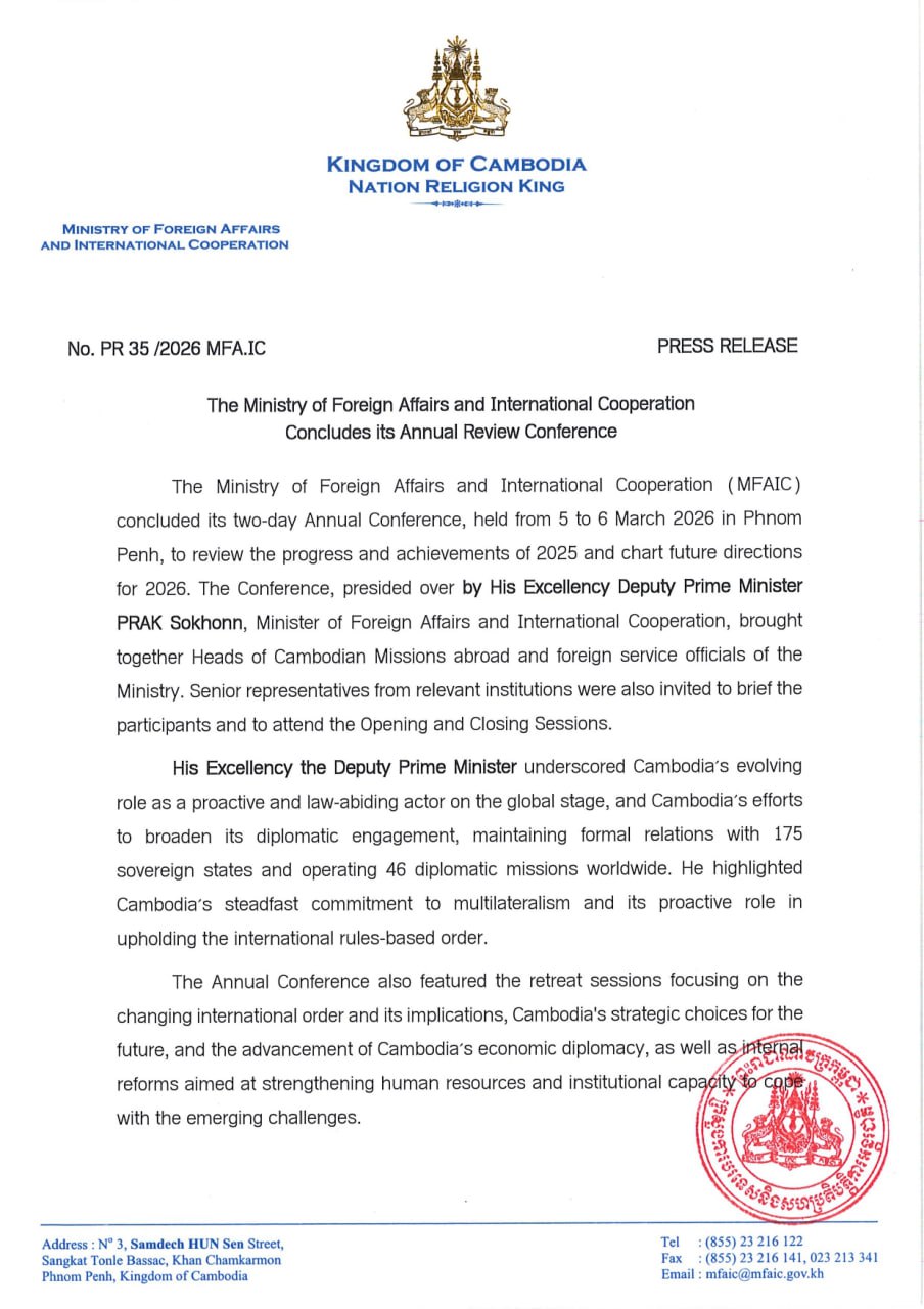 (Phnom Penh): Below are the outcomes of the annual review conference of the Ministry of Foreign Affairs and International Cooperation, held from 5 to 6 March 2026 in Phnom Penh.