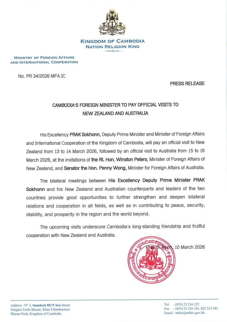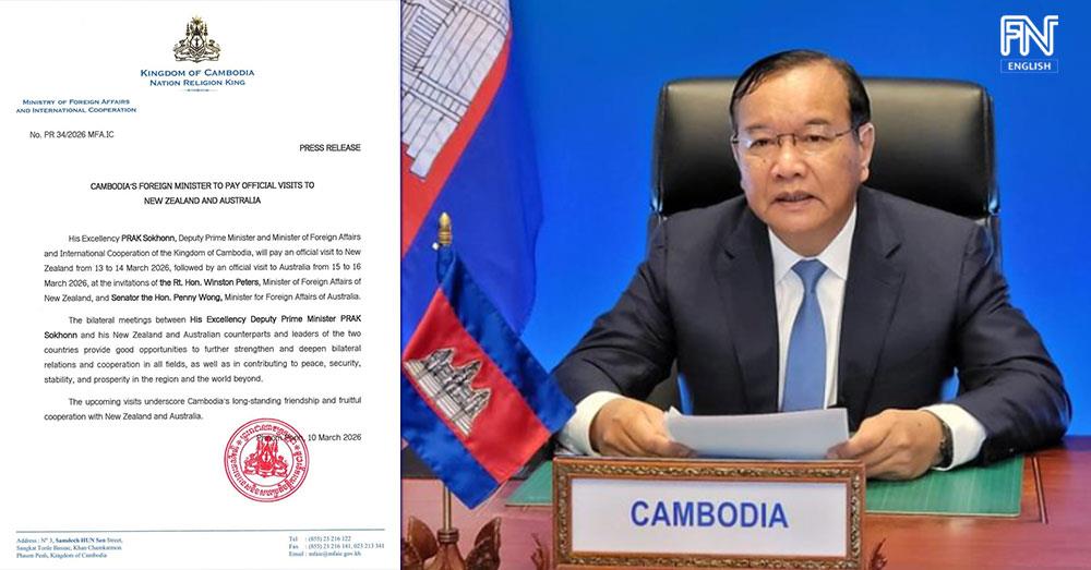 (Phnom Penh): Cambodian Foreign Minister Prak Sokhonn will pay an official visit to New Zealand from 13 to 14 March 2026, followed by an official visit to Australia from 15 to 16 March 2026, according to a press release seen by Fresh News on Wednesday (Mar. 11).