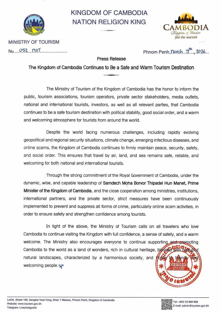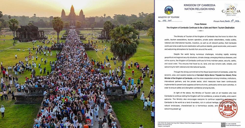 (Phnom Penh): Cambodian Ministry of Tourism reaffirmed that Cambodia continues to be a safe tourism destination with political stability, good social order, and a warm and welcoming atmosphere for tourists from around the world, according to the press release seen by Fresh News on Thursday (Mar. 12).