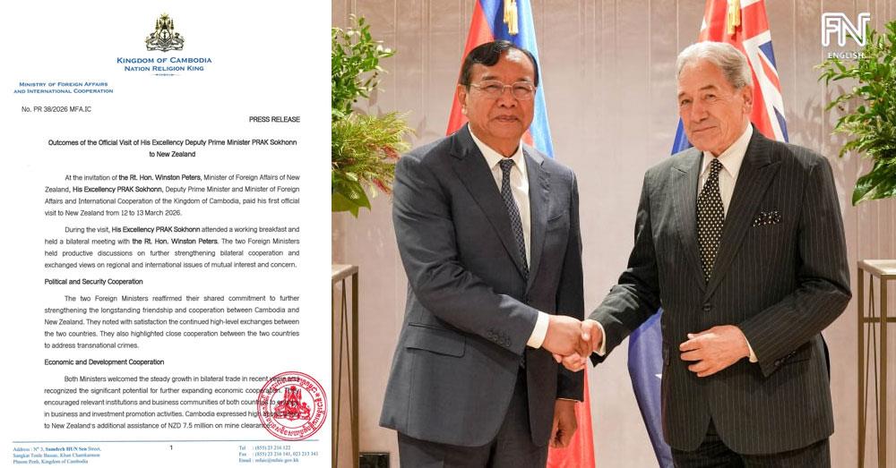 (Phnom Penh): Cambodia thanked New Zealand for its additional assistance of NZD 7.5 million for mine clearance during Cambodian Foreign Minister Prak Sokhonn’s official visit to New Zealand from 12–13 March 2026, at the invitation of New Zealand Foreign Minister Winston Peters.