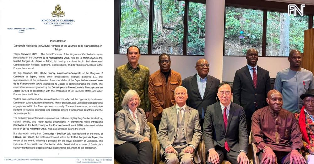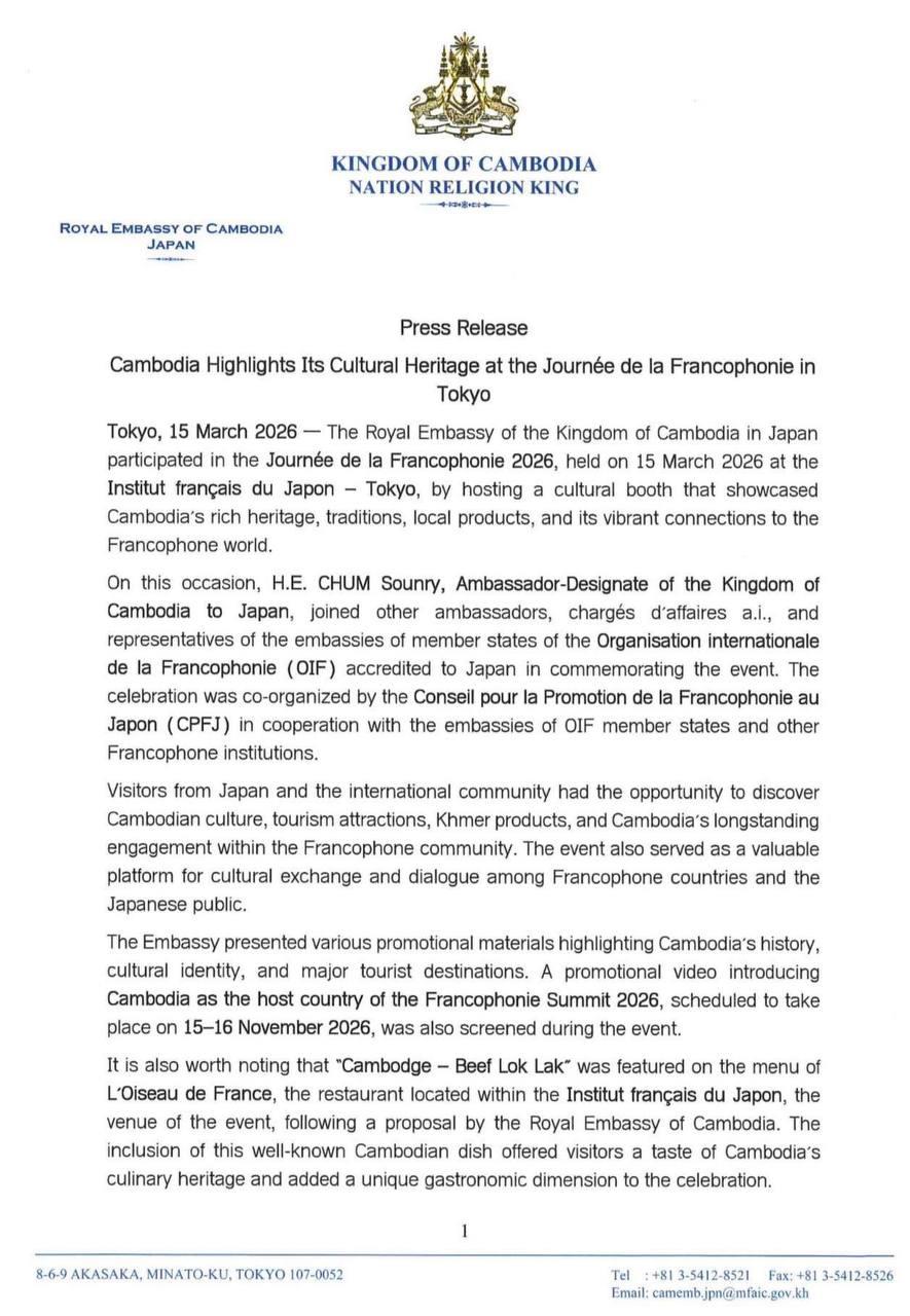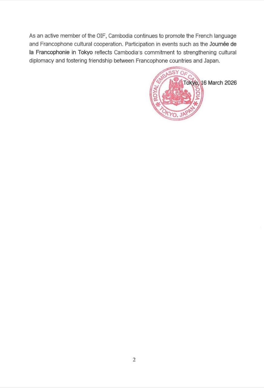 (Phnom Penh): The Royal Embassy of the Kingdom of Cambodia in Japan participated in the Journée de la Francophonie 2026, held on 15 March 2026 at the Institut français du Japon – Tokyo, by hosting a cultural booth that showcased Cambodia’s rich heritage, traditions, local products, and its vibrant connections to the Francophone world, according to a press release seen by Fresh News on Monday (Mar. 16).