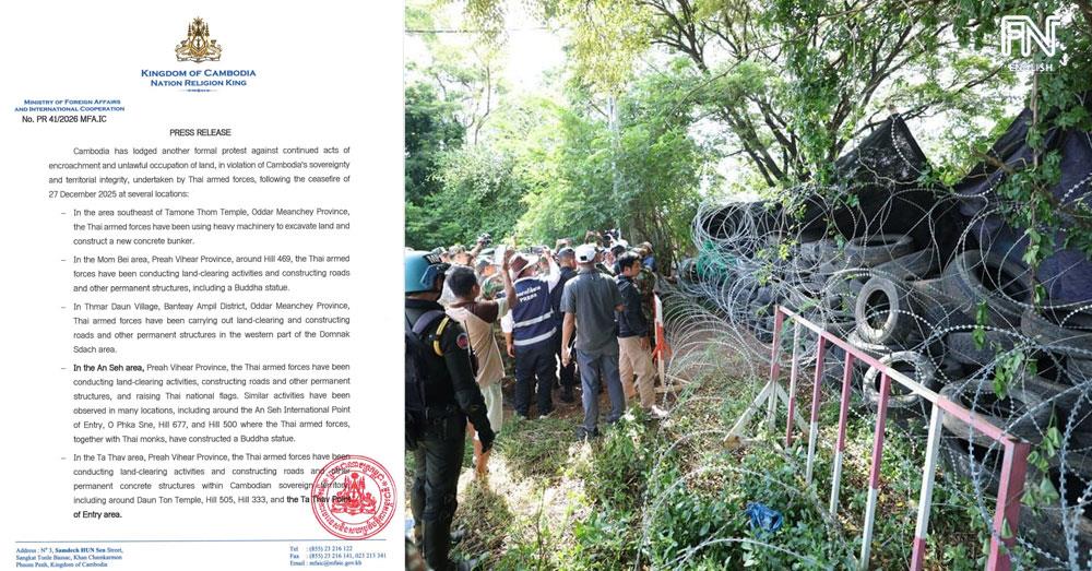 (Phnom Penh): Cambodia has lodged another formal protest against continued acts of encroachment and unlawful occupation of land, in violation of Cambodia’s sovereignty and territorial integrity, undertaken by Thai armed forces, following the ceasefire of 27 December 2025, according to a press release seen by Fresh News on Wednesday (Mar. 18).