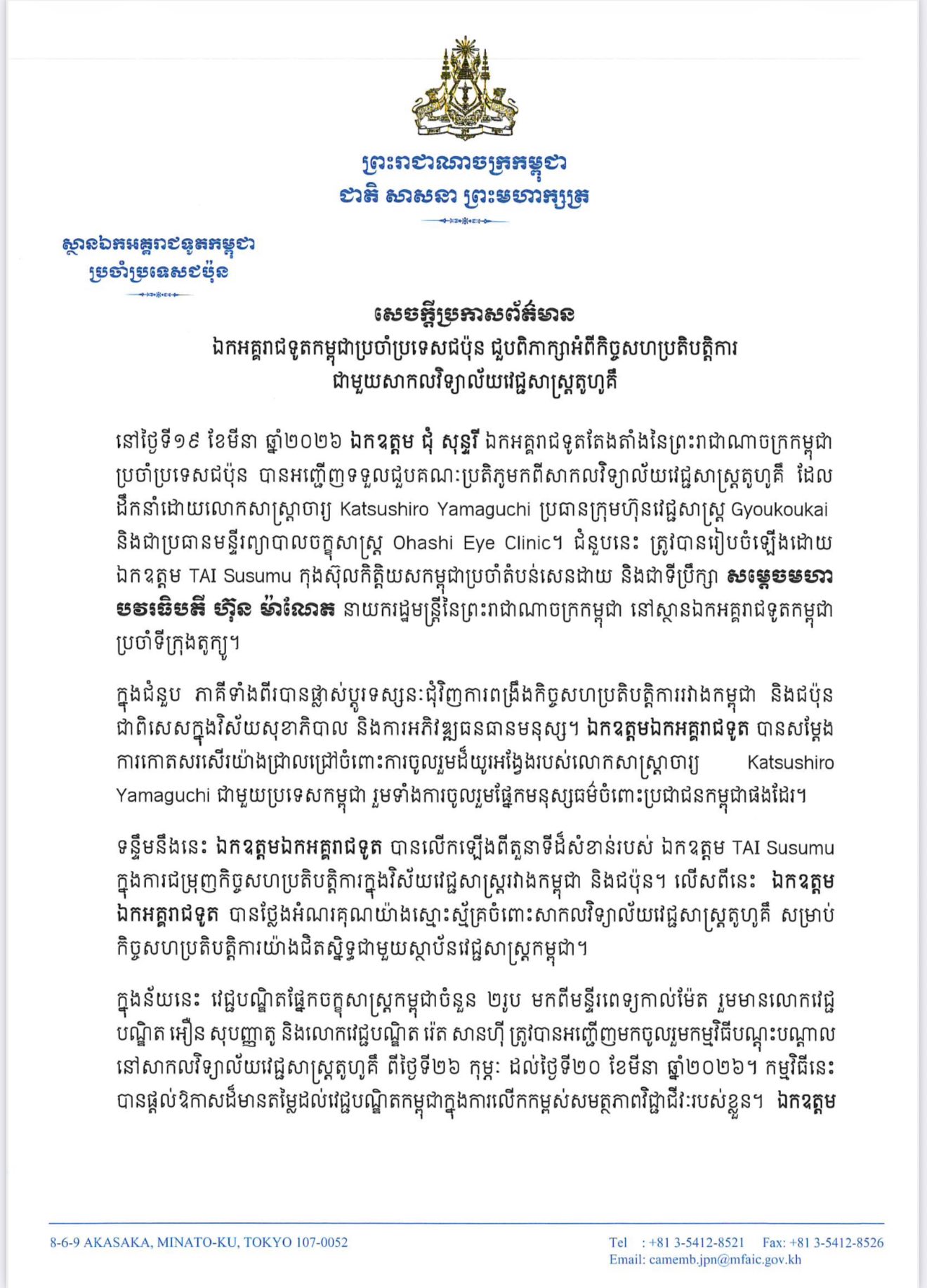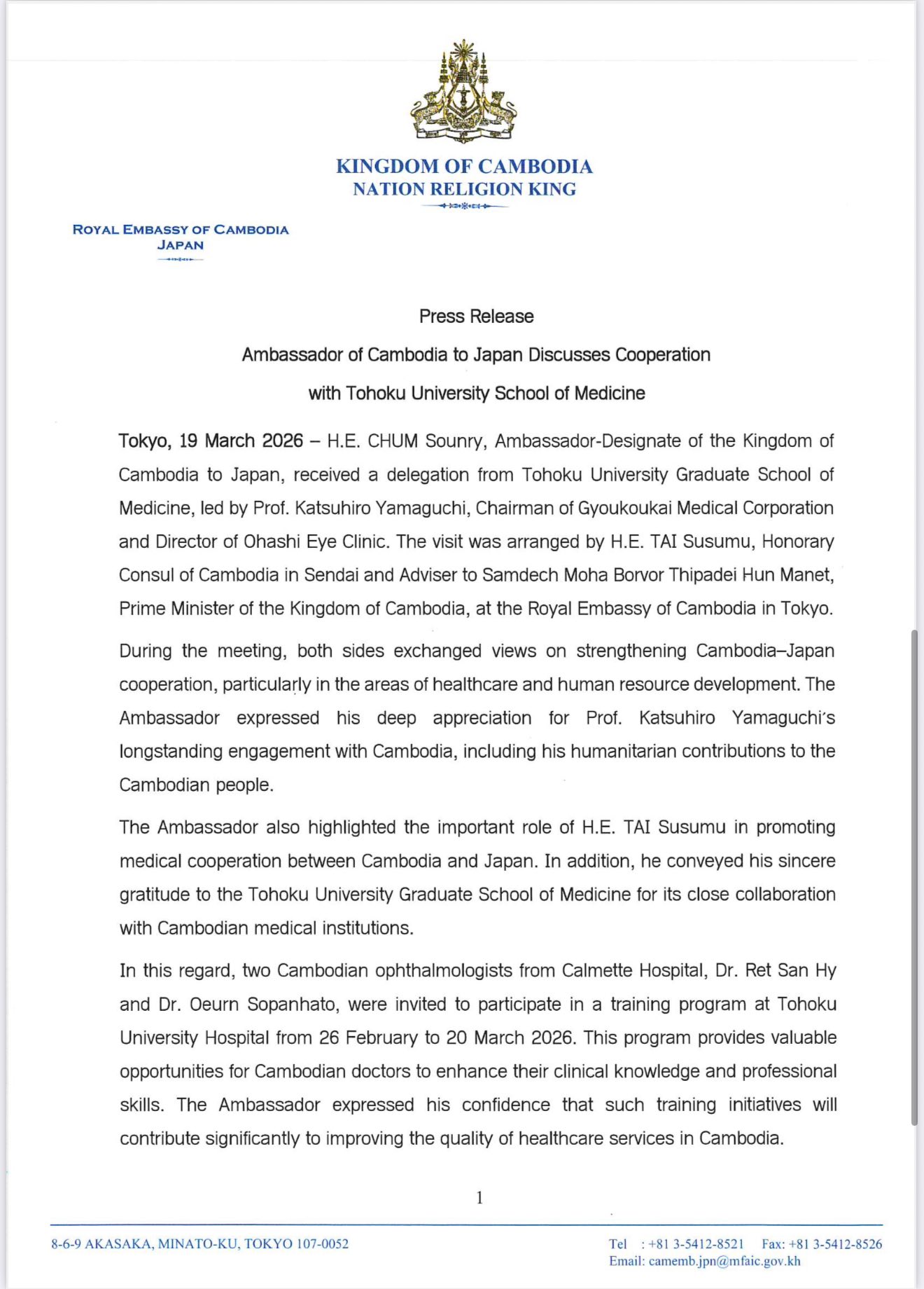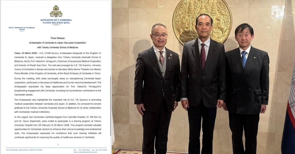 (Phnom Penh): Chum Sounry, Ambassador-Designate of the Kingdom of Cambodia to Japan, received a delegation from Tohoku University Graduate School of Medicine, led by Katsuhiro Yamaguchi, Chairman of Gyoukoukai Medical Corporation and Director of Ohashi Eye Clinic, according to a press release seen by Fresh News on Thursday (Mar. 19).