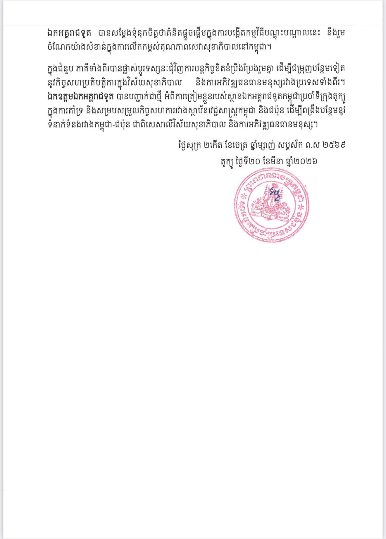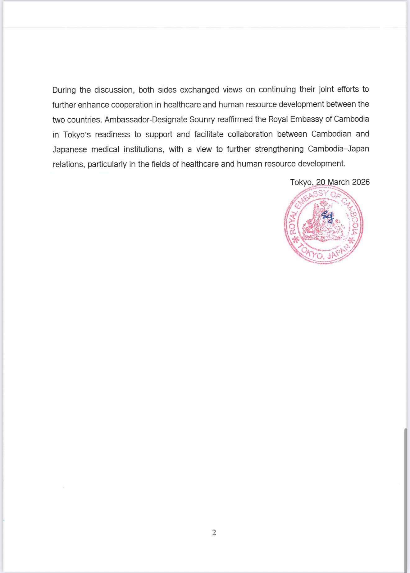 During the discussion, both sides exchanged views on continuing their joint efforts to further enhance cooperation in healthcare and human resource development between the two countries. Ambassador-Designate Sounry reaffirmed the Royal Embassy of Cambodia in Tokyo’s readiness to support and facilitate collaboration between Cambodian and Japanese medical institutions, with a view to further strengthening Cambodia–Japan relations, particularly in the fields of healthcare and human resource development.