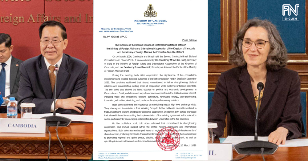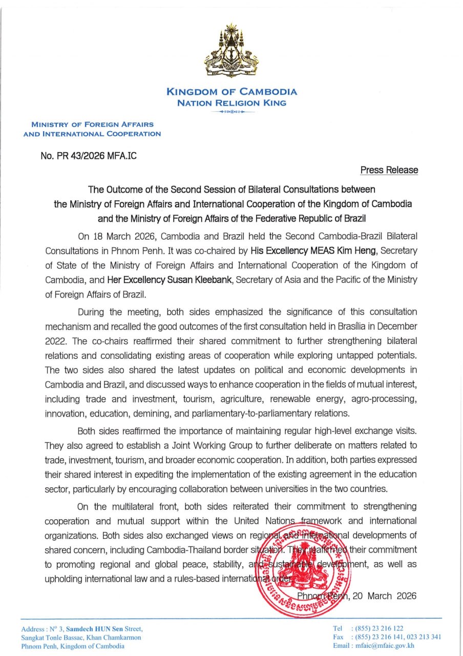 (Phnom Penh): On 18 March 2026, Cambodia and Brazil held the Second Cambodia-Brazil Bilateral Consultations in Phnom Penh, according to the press release seen by Fresh News on Friday (Mar. 20).