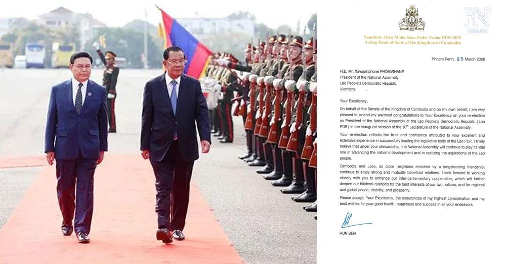 (Phnom Penh): Acting Head of State Samdech Techo Hun Sen congratulated Xaysomphone Phomvihane on his re-election as President of the National Assembly of the Lao People’s Democratic Republic (Lao PDR) in the inaugural session of the 10th Legislature of the National Assembly, according to the letter seen by Fresh News on Tuesday (Mar. 24).
