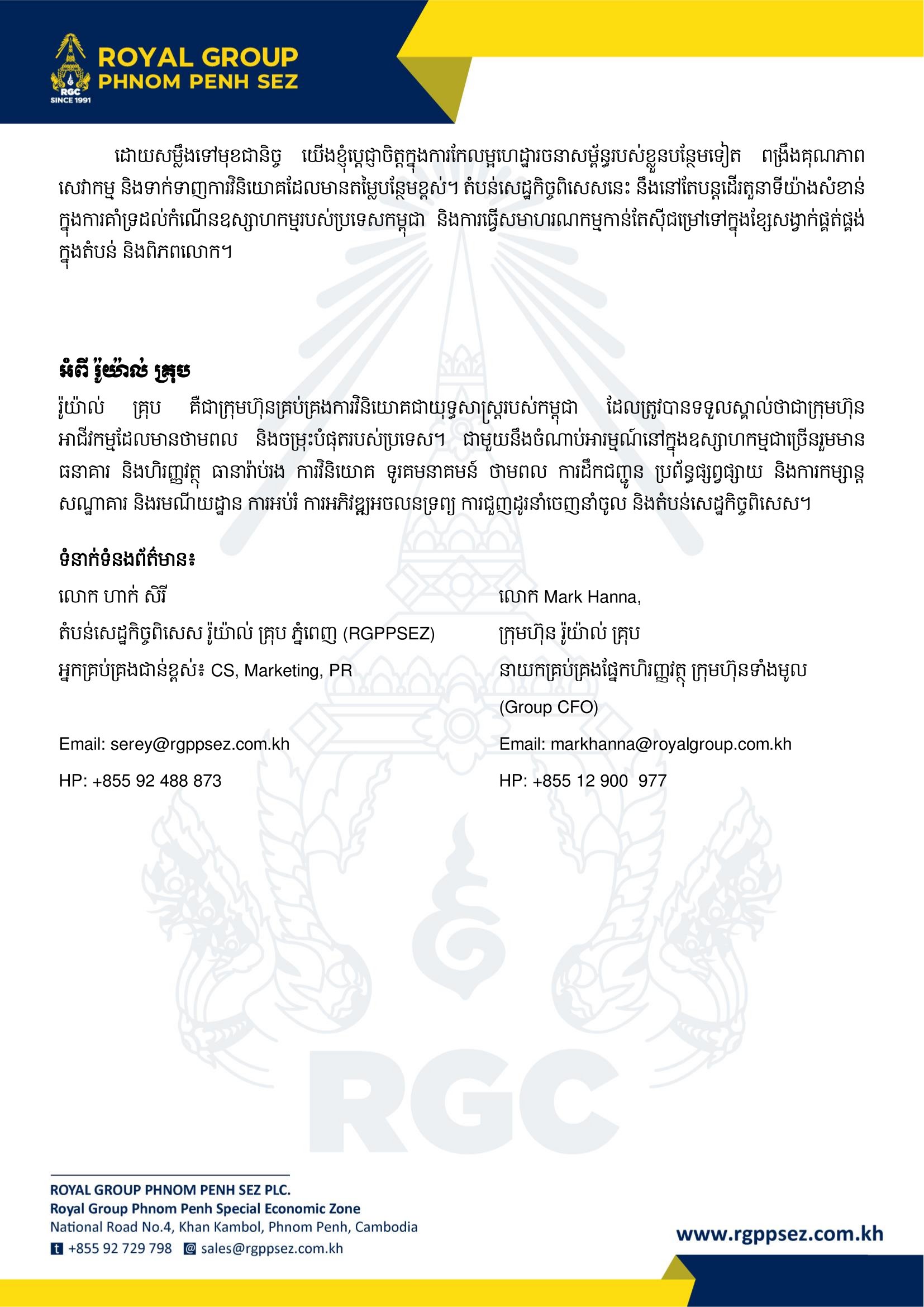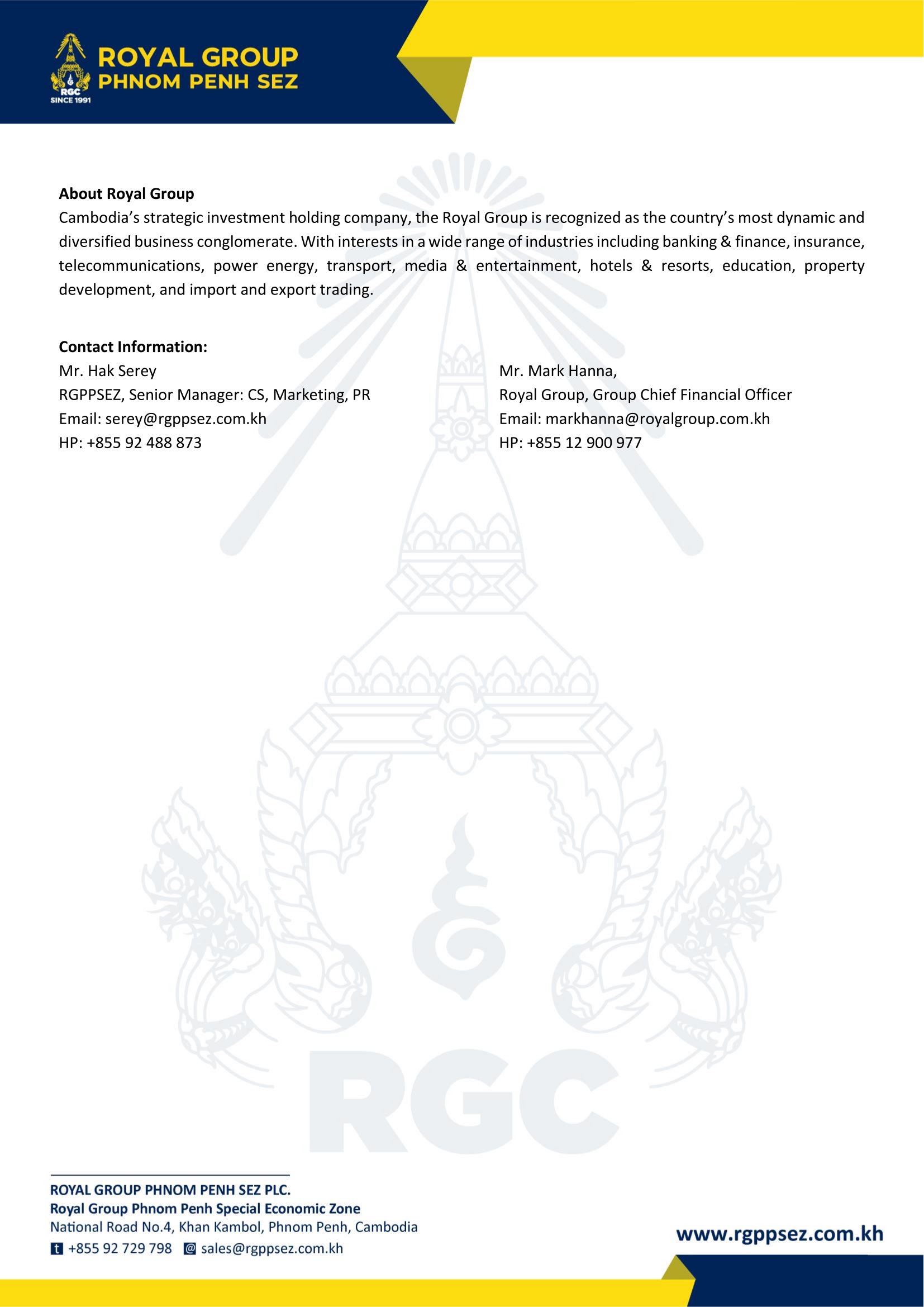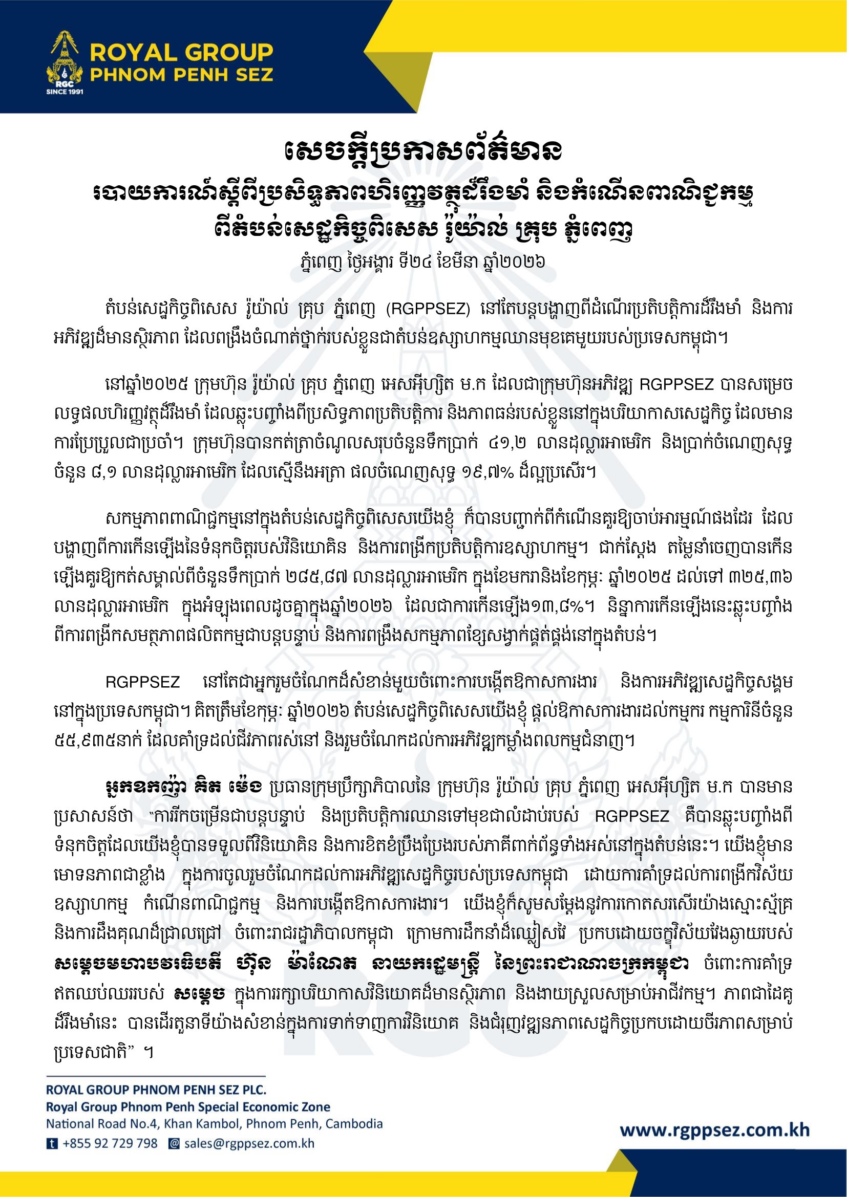 Neak Oknha Kith Meng, Chairman of Royal Group Phnom Penh SEZ PIc., stated, "The continued growth and strong performance of RGPPSEZ reflect the confidence of investors and the dedication of all stakeholders within the Zone. We are proud to contribute to Cambodia's economic development by supporting industrial expansion, trade growth, and job creation. We would also like to express our sincere appreciation to the Royal Government of Cambodia, under the leadership of Samdech Moha Borvor Thipadei HUN MANET, Prime Minister of the Kingdom of Cambodia, for his unwavering support in maintaining a stable and business-friendly environment. This strong partnership has been instrumental in attracting investment and driving sustainable economic progress for the country."