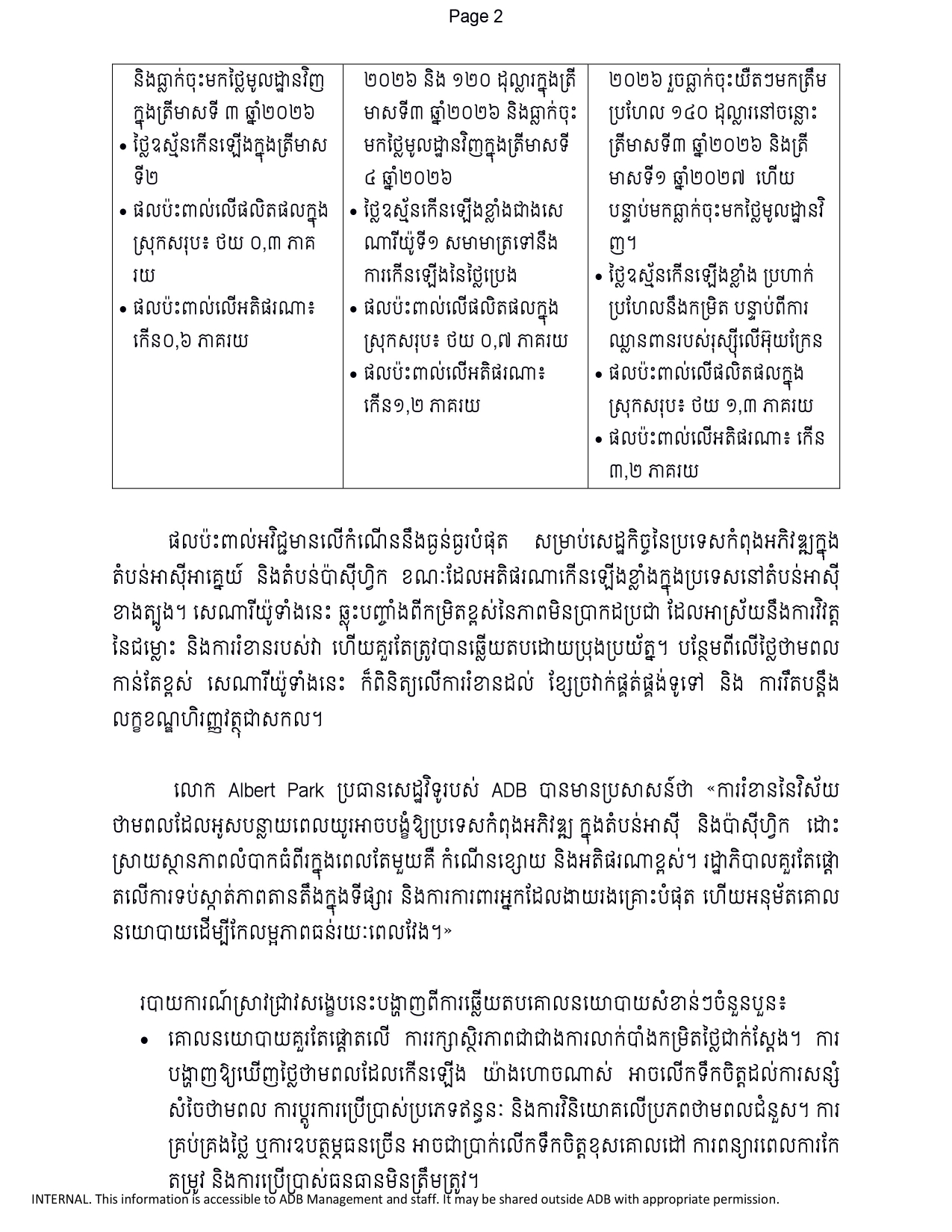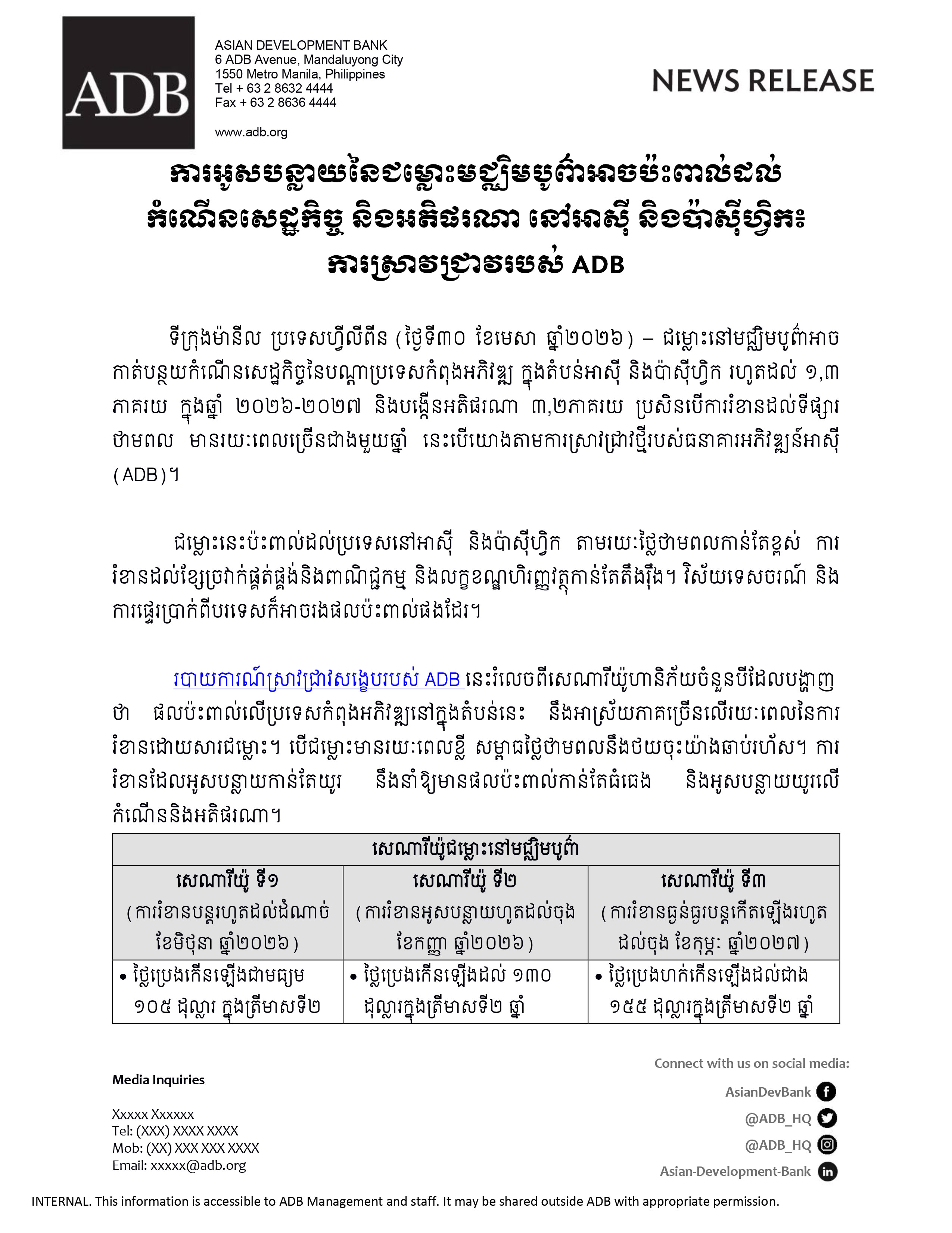 (Phnom Penh): The conflict in the Middle East could lower economic growth in developing Asia and the Pacific by up to 1.3 percentage points over 2026-2027 and raise inflation by 3.2 percentage points if energy market disruptions last more than a year, according to new research by the Asian Development Bank (ADB).