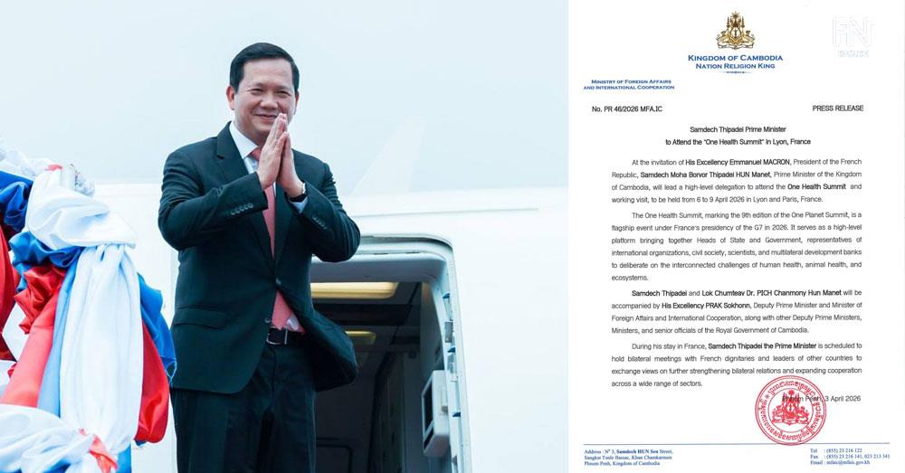 (Phnom Penh): At the invitation of Emmanuel Macron, President of the French Republic, Samdech Thipadei Hun Manet, Cambodian Prime Minister, will lead a high-level delegation to attend the One Health Summit and working visit, to be held from 6-9 April 2026 in Lyon and Paris, France, according to the press release seen by Fresh News on Friday (Apr. 3).