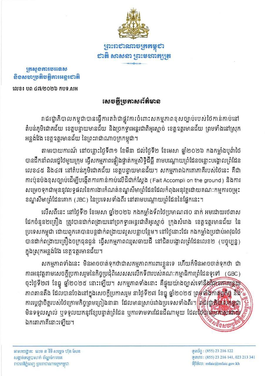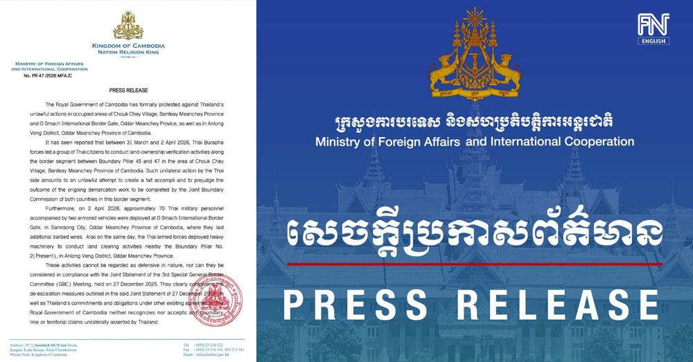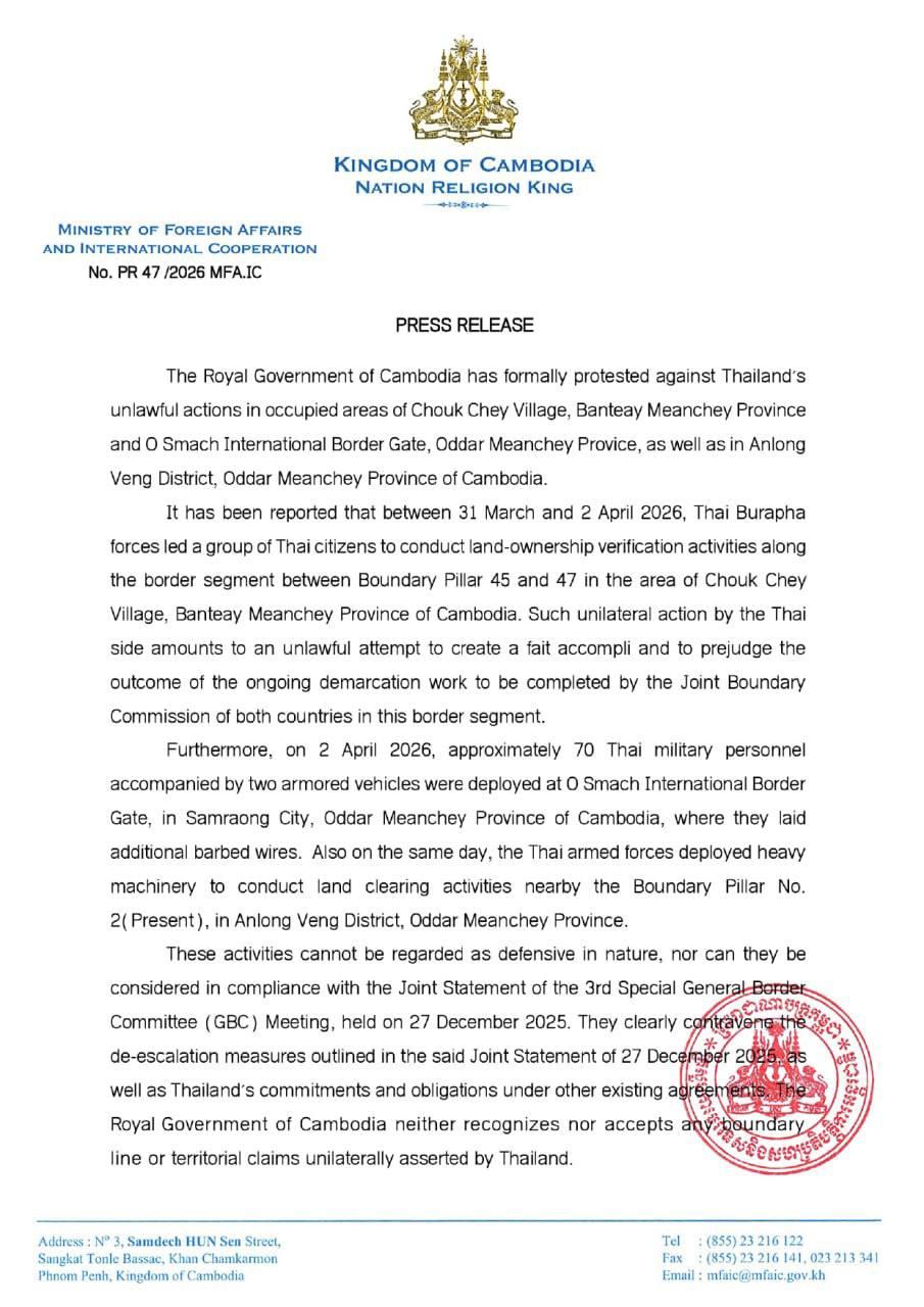 (Phnom Penh): The Royal Government of Cambodia has formally protested against Thailand's unlawful actions in occupied areas of Chouk Chey Village, Banteay Meanchey Province and O Smach International Border Gate, Oddar Meanchey Provice, as well as in Anlong Veng District, Oddar Meanchey Province of Cambodia, according to a press release seen by Fresh News on Saturday (Apr. 4).