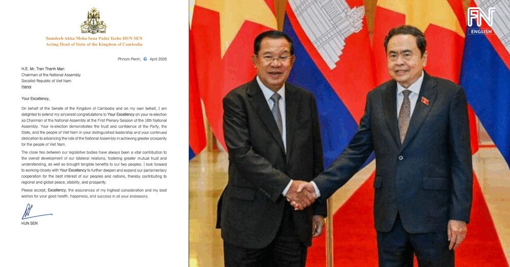 (Phnom Penh): Acting Head of State, Samdech Techo Hun Sen, extended his sincere congratulations to Tran Thanh Man on his re-election as Chairman of the National Assembly of Viet Nam at the First Plenary Session of the 16th National Assembly, according to a letter seen by Fresh News on Tuesday (Apr. 7).