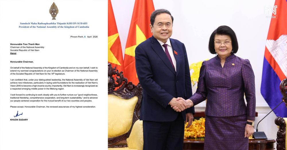 (Phnom Penh): Cambodian National Assembly President, Samdech Thipadei Khuon Sudary, extended her warmest congratulations to Tran Thanh Man on his re-election as Chairman of the National Assembly of the Socialist Republic of Viet Nam for the 16th legislature, according to a letter seen by Fresh News on Tuesday (Apr. 7).