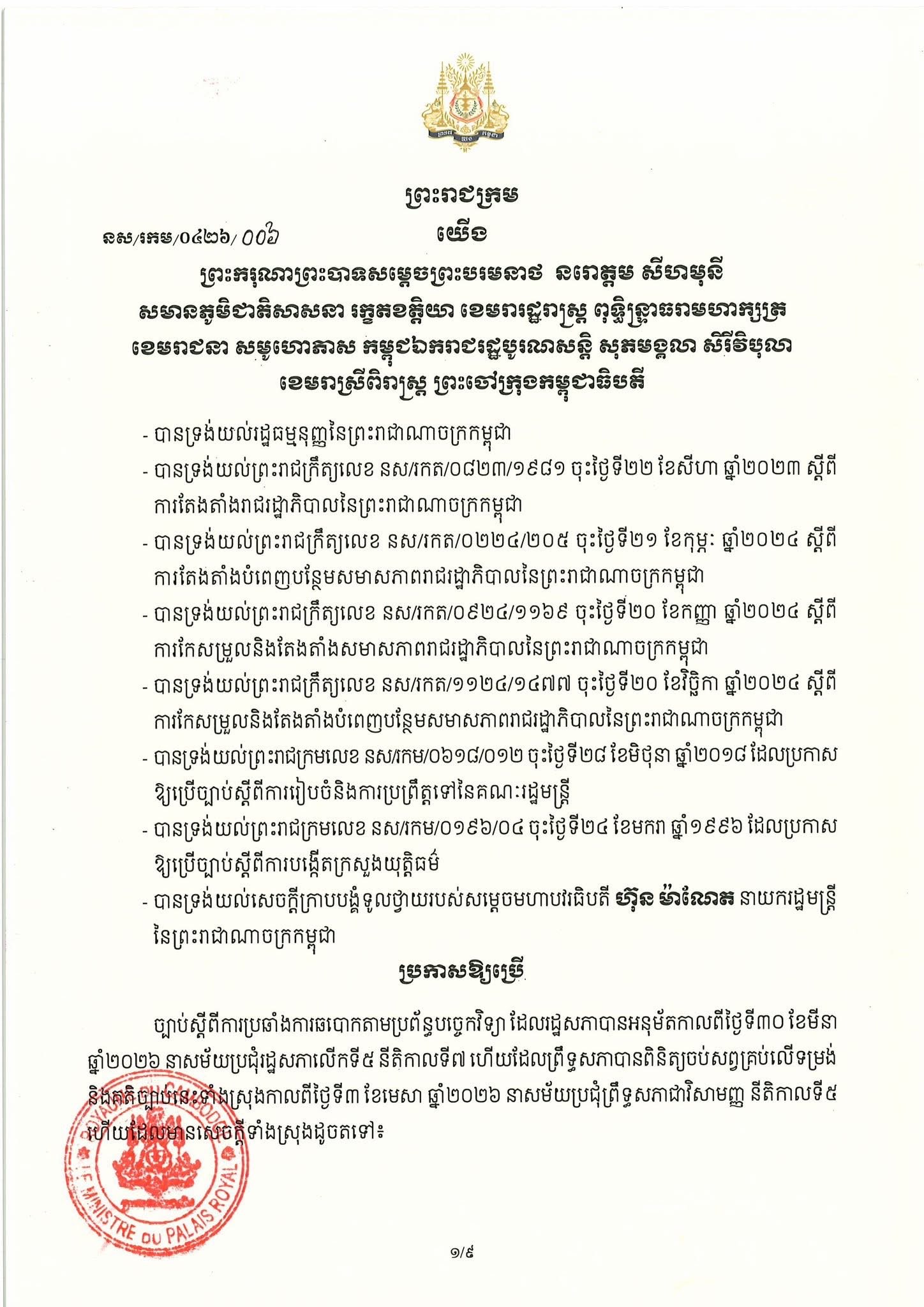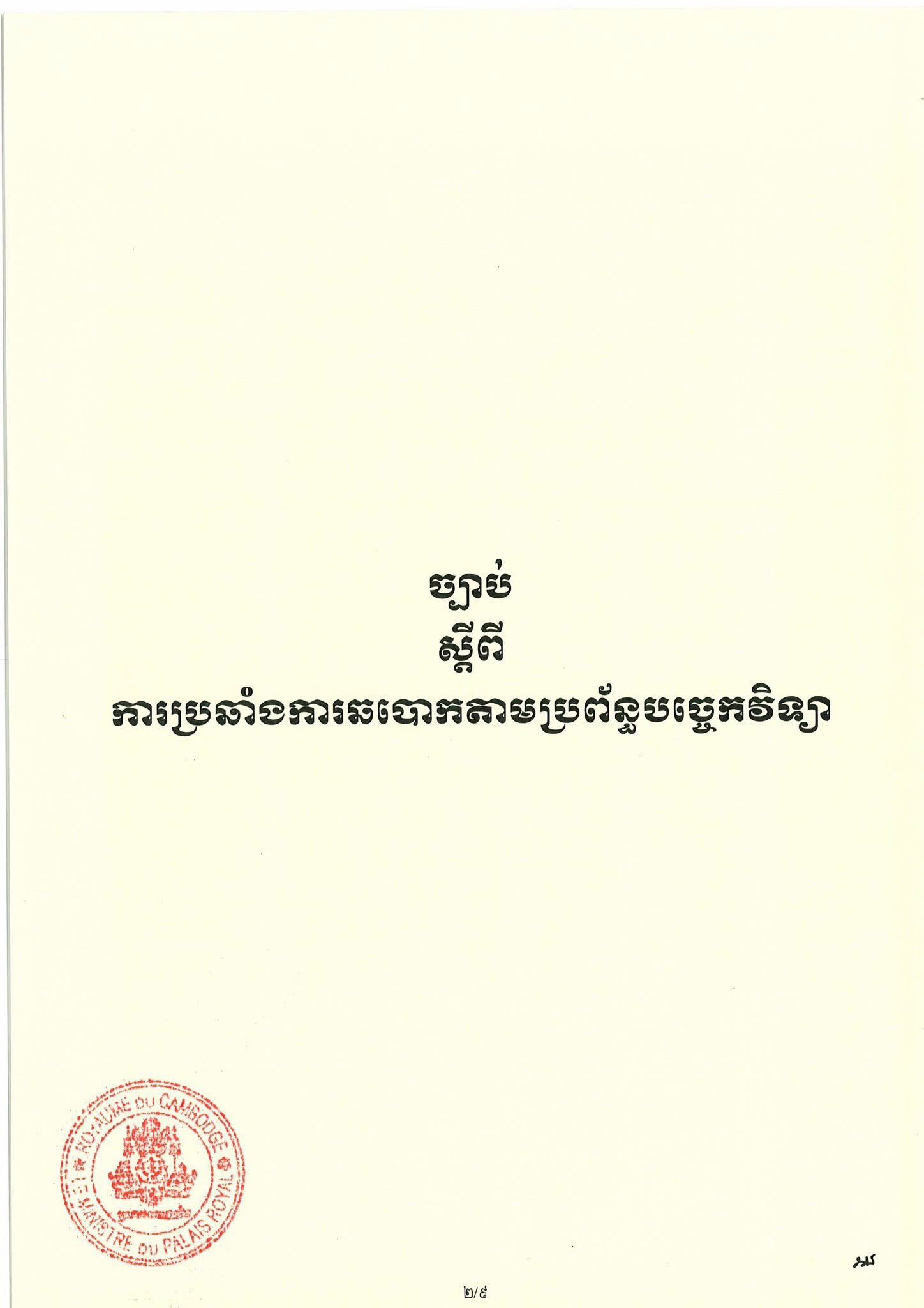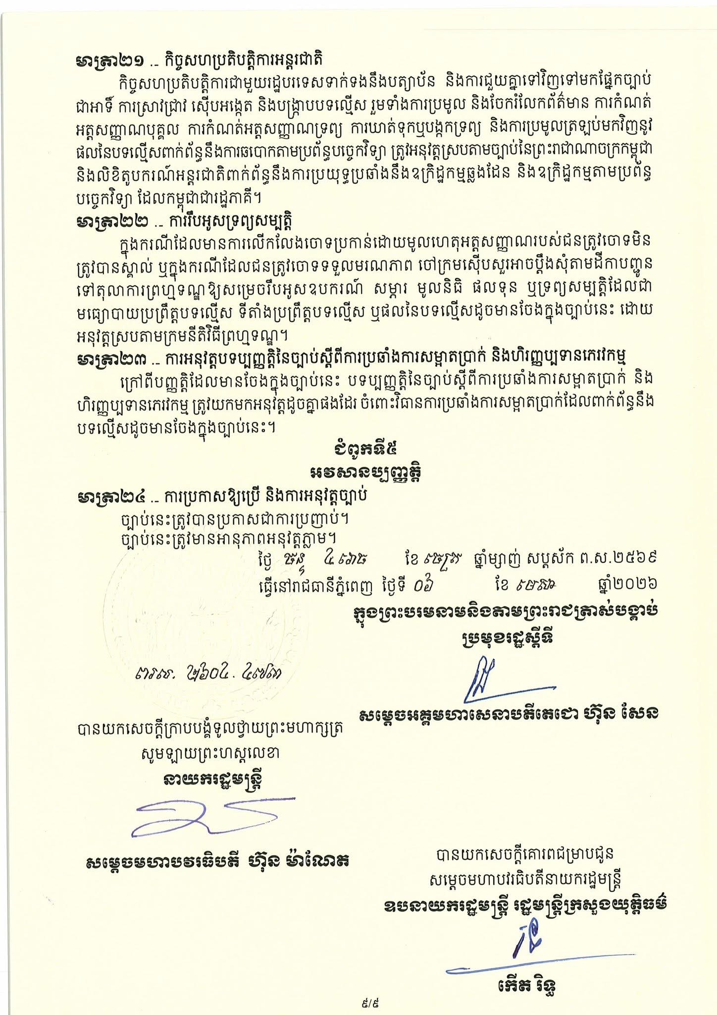(Phnom Penh): On 6 April 2026, Cambodian Acting Head of State Samdech Techo Hun Sen issued a Royal Decree promulgating the Law on Combating Technology-based Fraud.