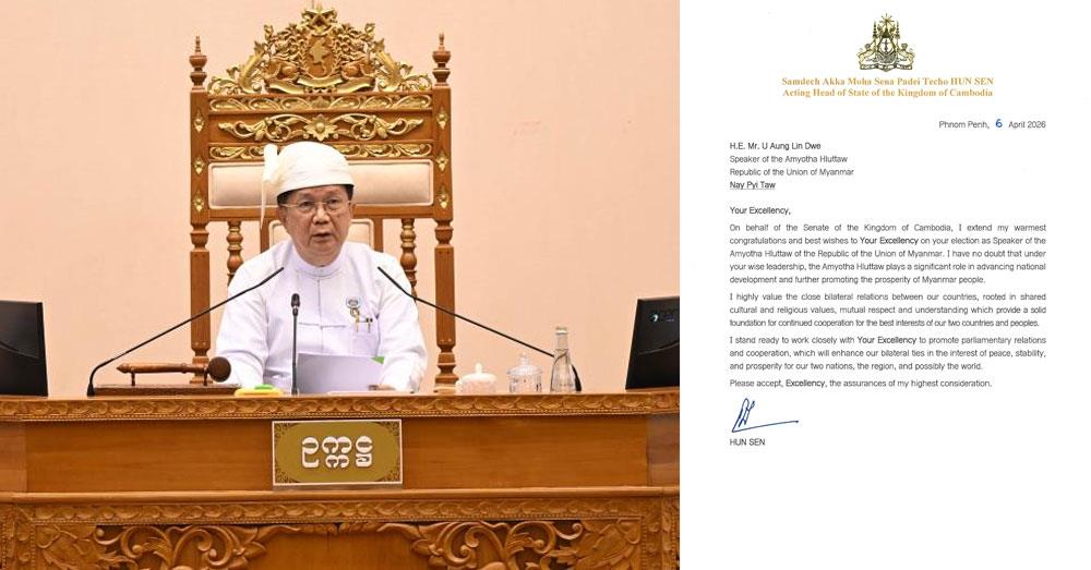 (Phnom Penh): Cambodia’s Acting Head of State, Samdech Techo Hun Sen, extended congratulations to U Aung Lin Dwe on his election as Speaker of the Amyotha Hluttaw of the Republic of the Union of Myanmar, according to the letter seen by Fresh News on Tuesday (Apr. 7).