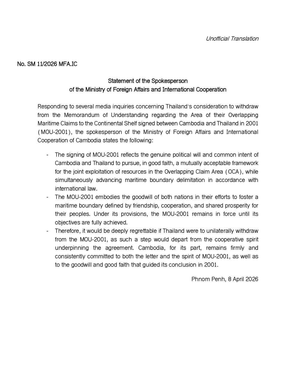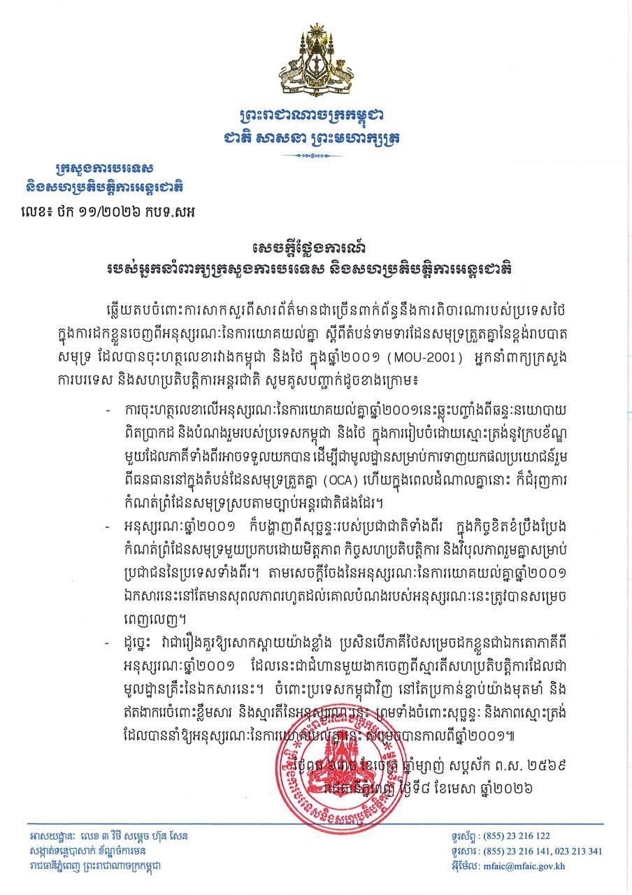 Responding to several media inquiries concerning Thailand's consideration to withdraw from the Memorandum of Understanding regarding the Area of their Overlapping Maritime Claims to the Continental Shelf signed between Cambodia and Thailand in 2001 (MOU-2001), the Spokesperson underlined that the signing of MOU-2001 reflects the genuine political will and common intent of Cambodia and Thailand to pursue, in good faith, a mutually acceptable framework for the joint exploitation of resources in the Overlapping Claim Area (OCA), while simultaneously advancing maritime boundary delimitation in accordance with international law.