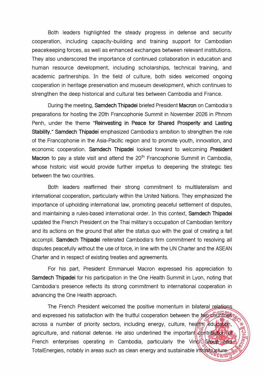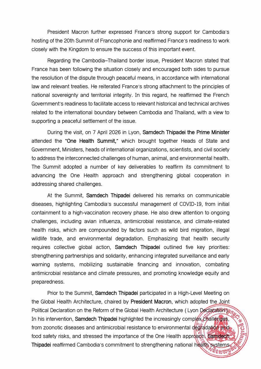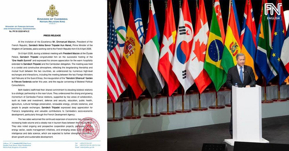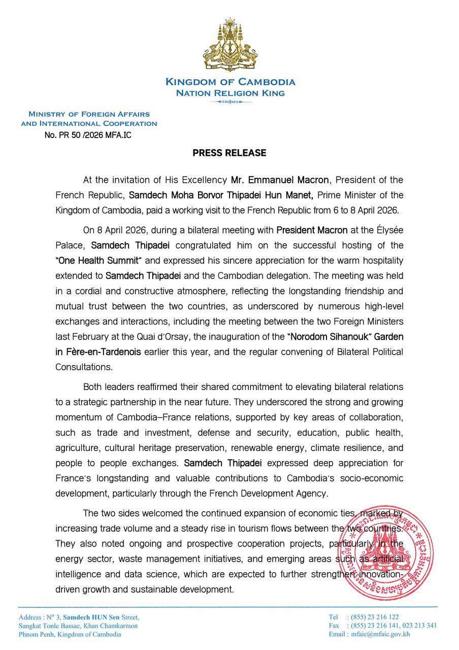 (Phnom Penh): Below is a press release on the outcome of the working visit of Cambodian Prime Minister Hun Manet to the French Republic.