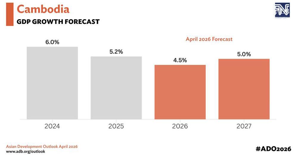 (Phnom Penh): Cambodia’s economy is projected to expand by 4.5 per cent in 2026 if global commodity market disruptions are not prolonged by the conflict in the Middle East, according to the latest edition of the Asian Development Bank’s (ADB) flagship economic report published today.