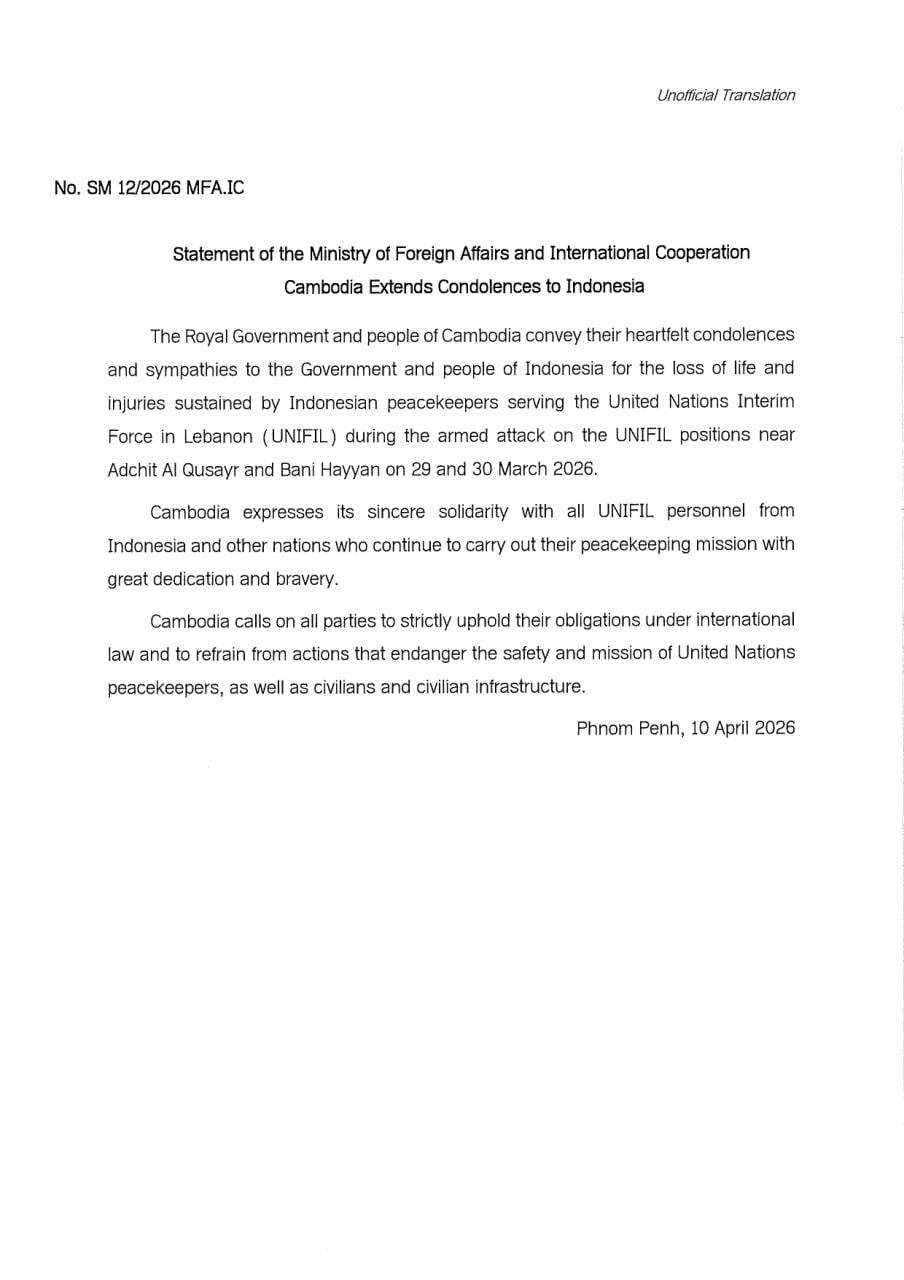 (Phnom Penh): The Royal Government and people of Cambodia conveyed their heartfelt condolences and sympathies to the Government and people of Indonesia for the loss of life and injuries sustained by Indonesian peacekeepers serving the United Nations Interim Force in Lebanon (UNIFIL) during the armed attack on the UNIFIL positions near Adchit Al Qusayr and Bani Hayyan on 29 and 30 March 2026, according to a statement seen by Fresh News on Friday (Apr. 10).