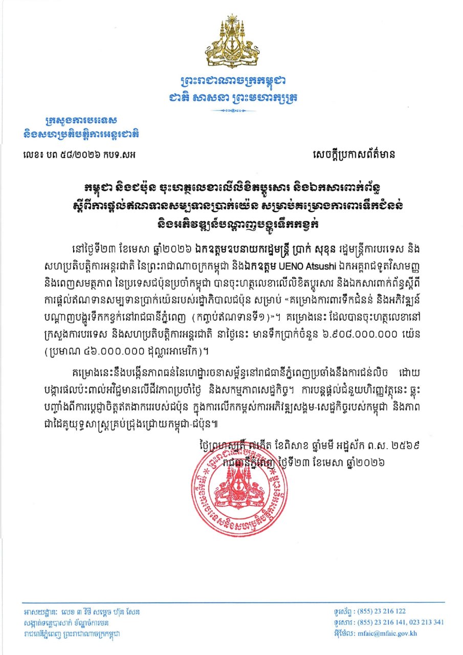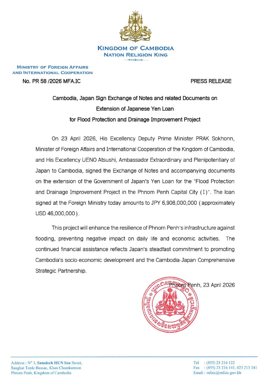 (Phnom Penh): Cambodian Foreign Minister Prak Sokhonn and Ueno Atsushi, Ambassador Extraordinary and Plenipotentiary of Japan to Cambodia, signed the Exchange of Notes and accompanying documents on the extension of the Government of Japan's Yen Loan for the "Flood Protection and Drainage Improvement Project in the Phnom Penh Capital City (I)", according to the press release seen by Fresh News on Friday (Apr. 24).