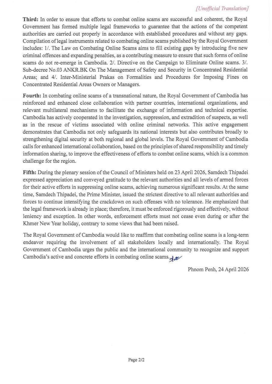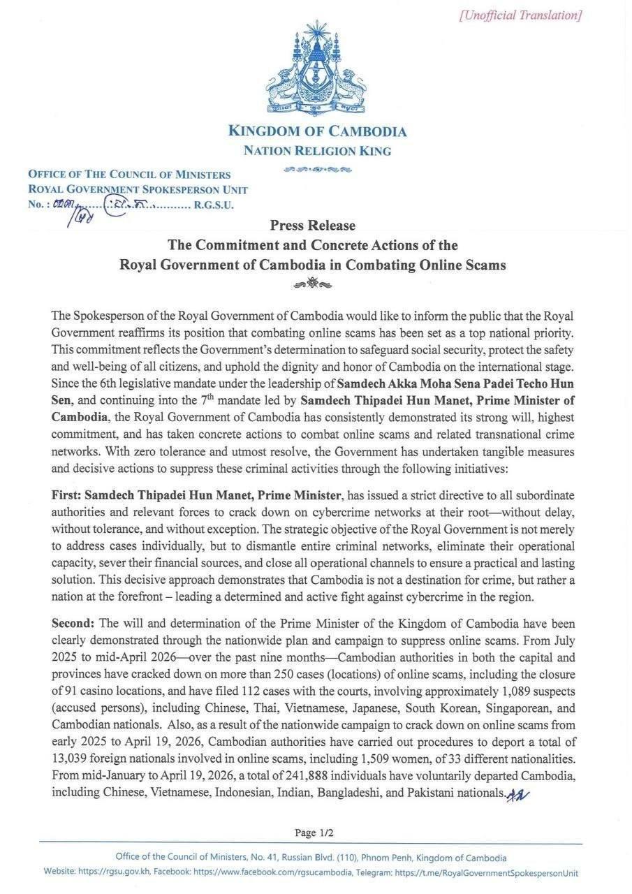 (Phnom Penh): The Royal Government of Cambodia reaffirmed its position that combating online scams has been set as a top national priority. This commitment reflects the Government’s determination to safeguard social security, protect the safety and well-being of all citizens, and uphold the dignity and honor of Cambodia on the international stage, according to a press release issued by the Spokesperson of the Royal Government of Cambodia dated 24 April 2026.