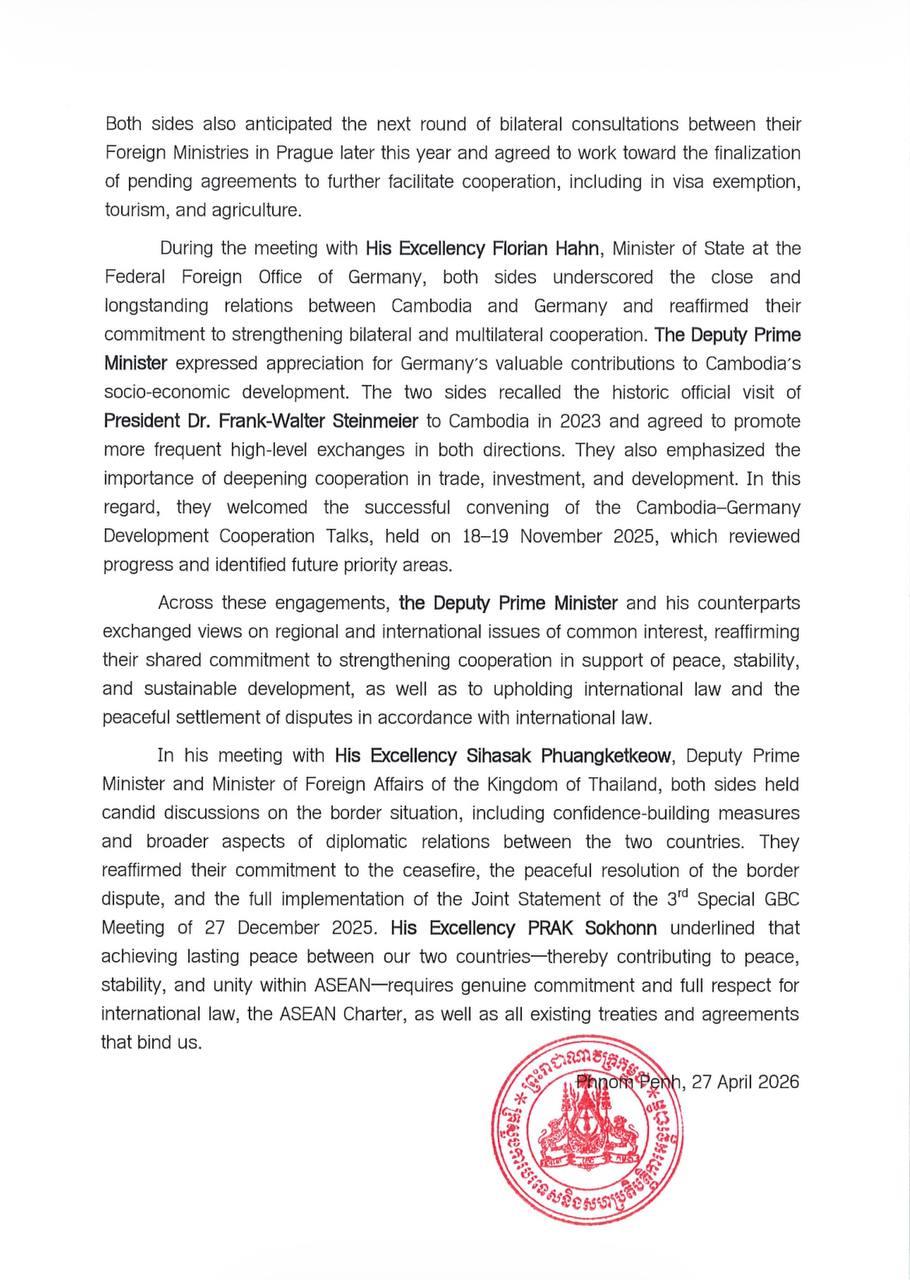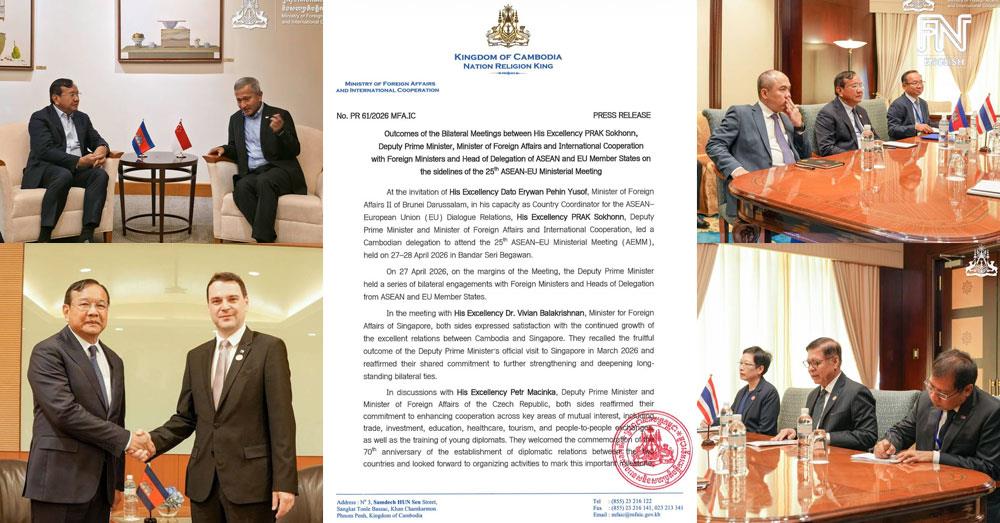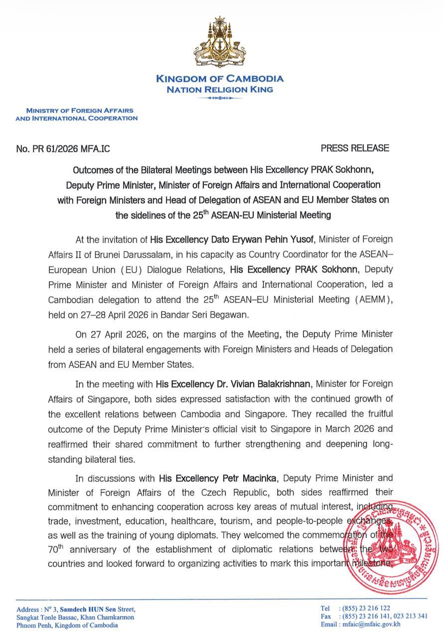 (Phnom Penh): The following are the outcomes of bilateral meetings held by Cambodian Foreign Minister Prak Sokhonn with foreign ministers and heads of delegation from ASEAN and EU member states on the sidelines of the 25th ASEAN–EU Ministerial Meeting (AEMM), held on 27-28 April 2026, in Bandar Seri Begawan.