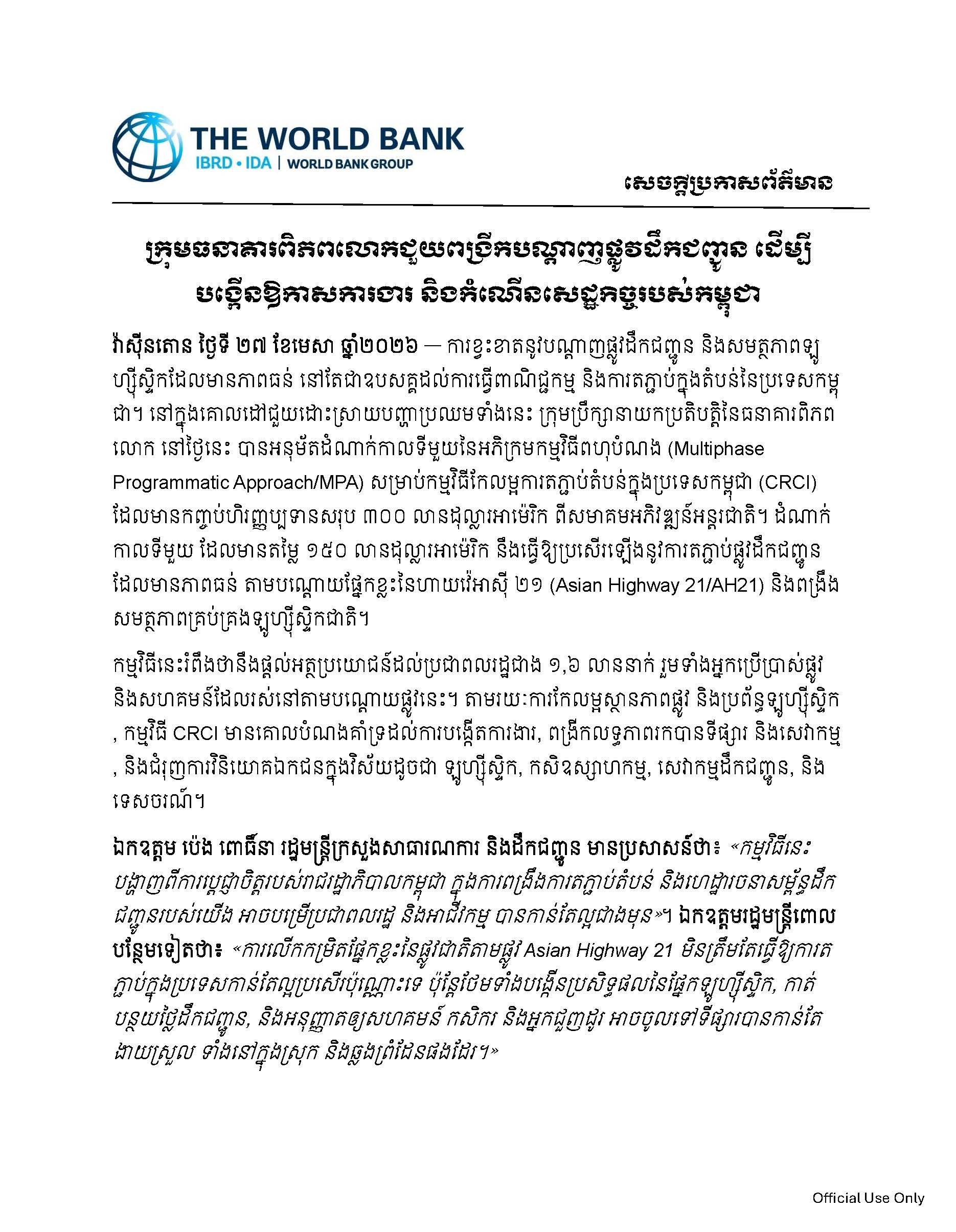 (Phnom Penh): Gaps in resilient transport links and logistics capacity continue to constrain Cambodia’s trade and regional connectivity. To help address these challenges, the World Bank’s Board of Executive Directors today approved the first phase of the Multiphase Programmatic Approach (MPA) Cambodia Regional Connectivity Improvement (CRCI) Program, with an overall USD 300 million International Development Association financing envelope.