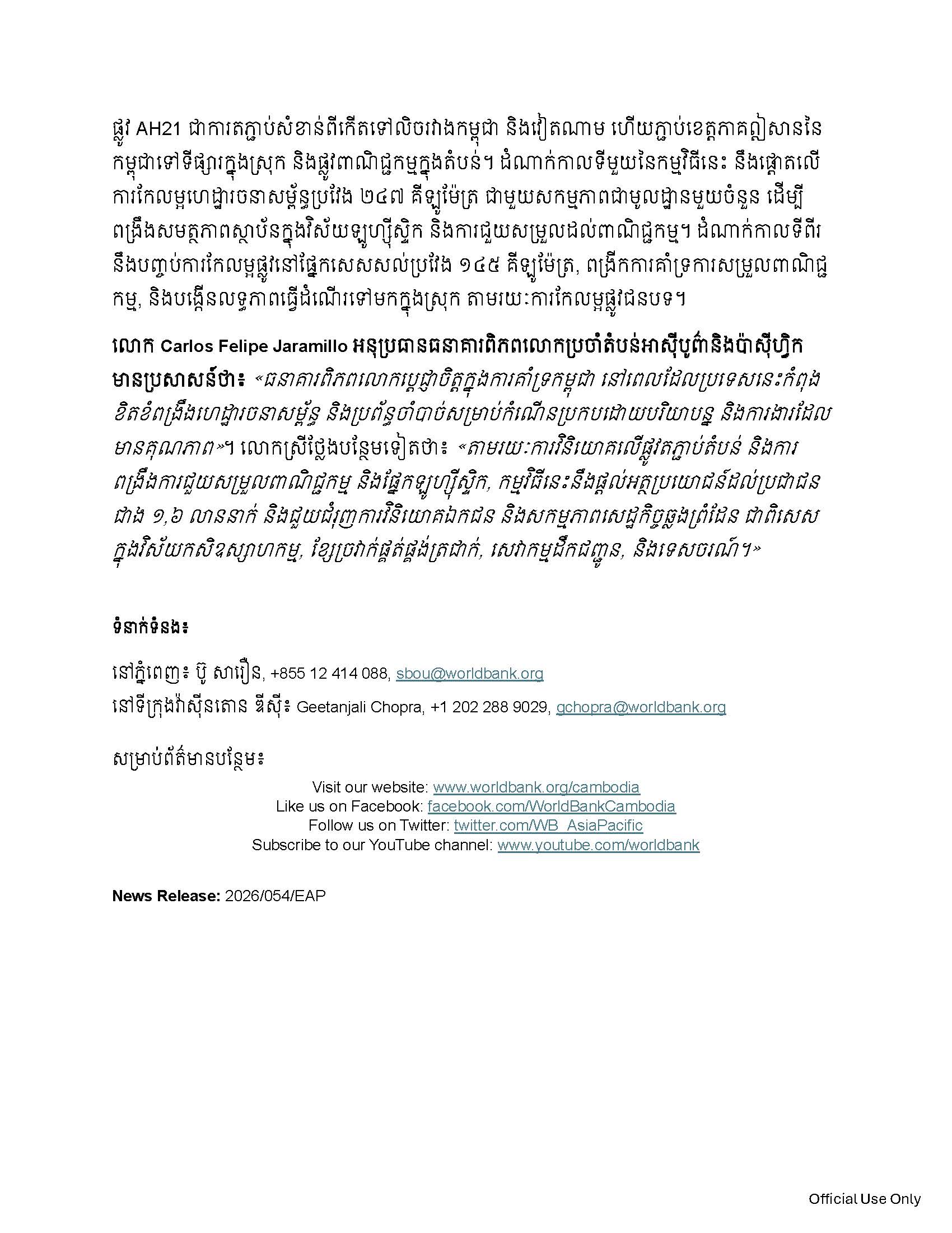 “The World Bank is committed to standing with Cambodia as it strengthens the infrastructure and systems needed for inclusive growth and quality jobs,” said Carlos Felipe Jaramillo, World Bank Vice President for East Asia and Pacific. “Through investments in regional road corridors and stronger trade facilitation and logistics, this program will benefit more than 1.6 million people and help catalyze private investment and cross-border economic activity, particularly in agribusiness, cold chains, transport services, and tourism.”