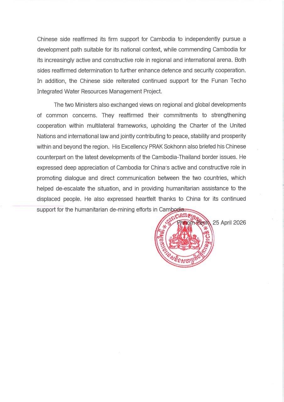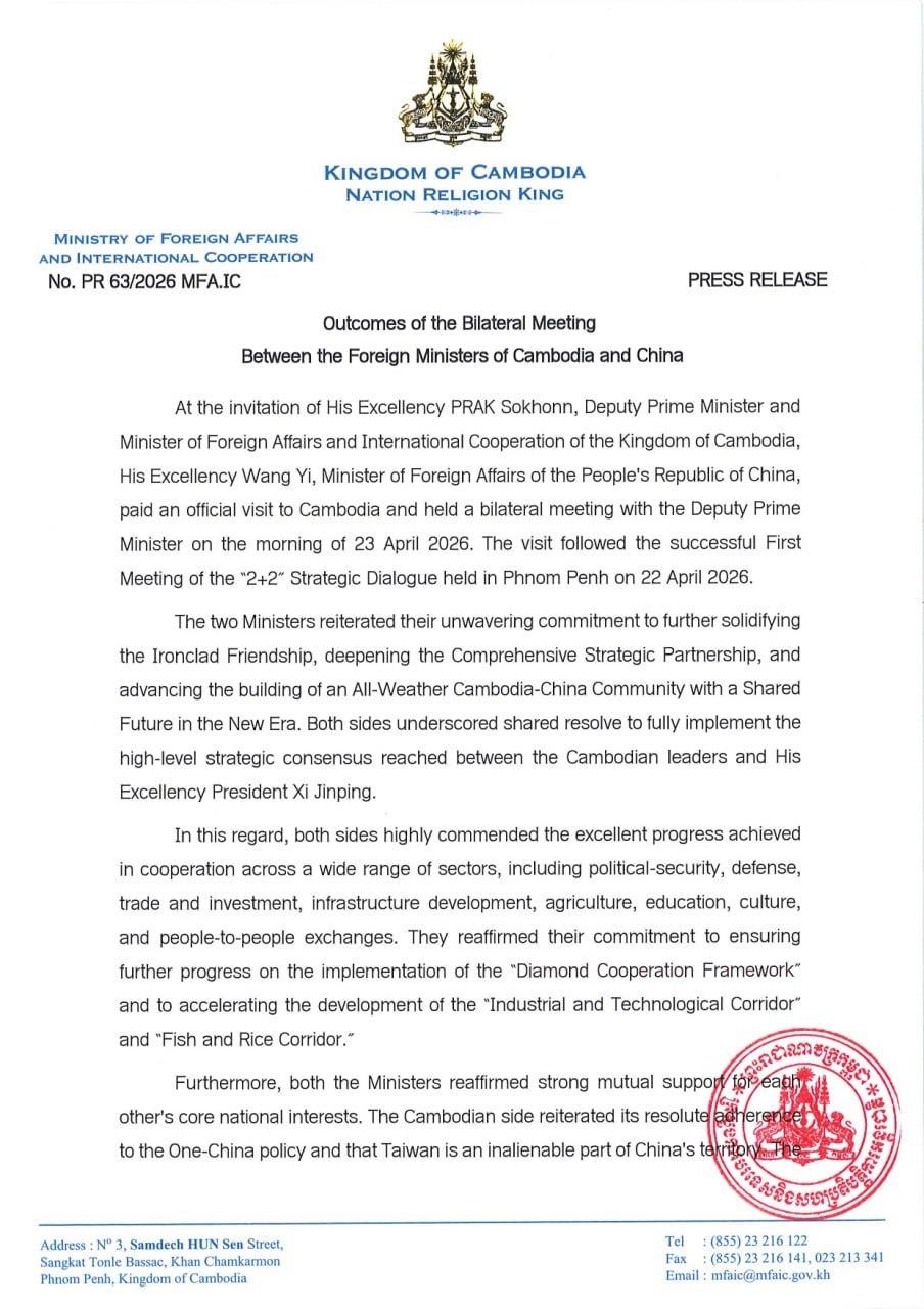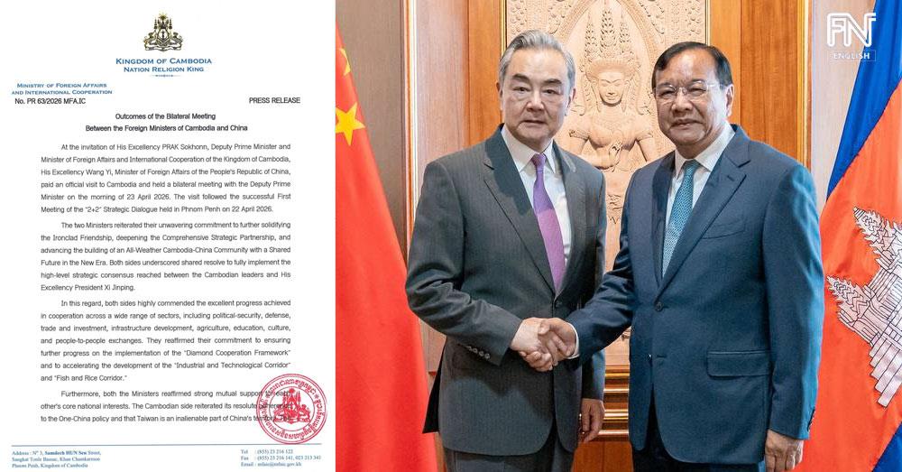 (Phnom Penh): The following are the outcomes of the bilateral meeting between Cambodian Foreign Minister Prak Sokhonn and Chinese Foreign Minister Wang Yi, who paid an official visit to Cambodia on 23 April 2026.