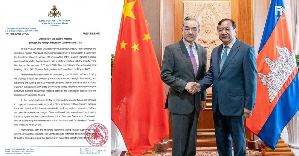 (Phnom Penh): In his bilateral meeting with Cambodian Foreign Minister Prak Sokhonn, Chinese Foreign Minister Wang Yi reiterated China’s continued support for the Funan Techo Integrated Water Resources Management Project, according to the outcomes seen by Fresh News on Wednesday (Apr. 29).