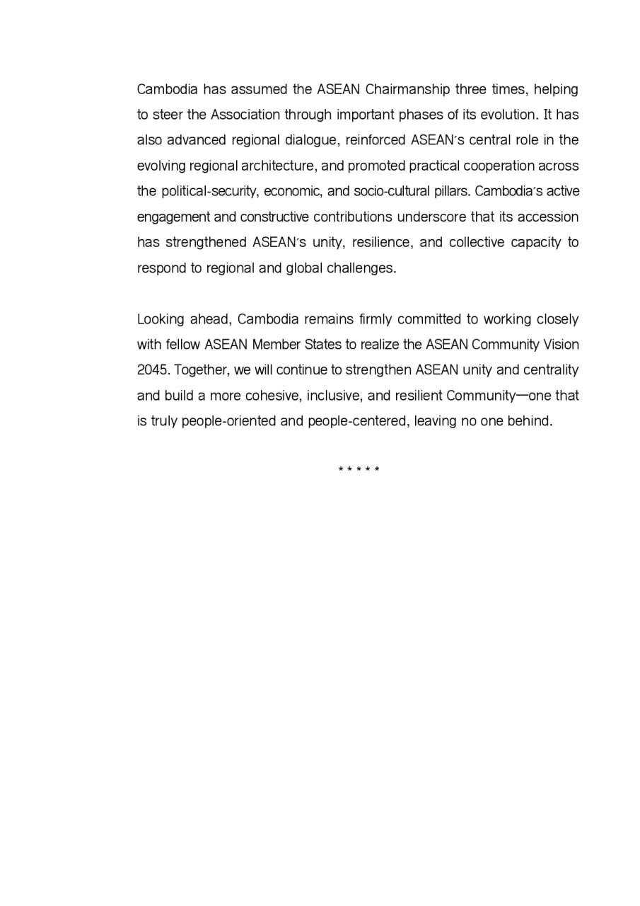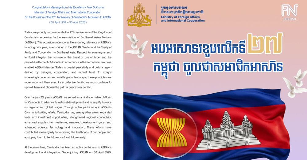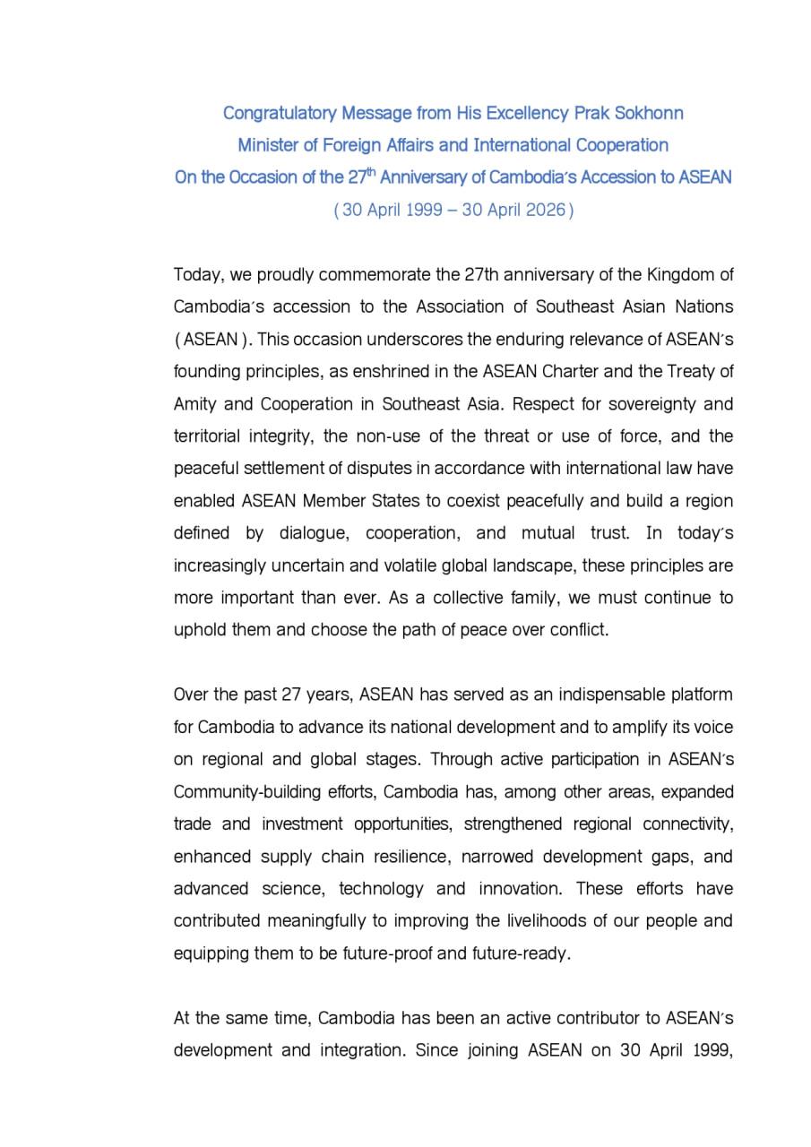 (Phnom Penh): The following is the congratulatory message from Cambodian Foreign Minister Prak Sokhonn on the occasion of the 27th anniversary of Cambodia’s accession to ASEAN (30 April 1999 – 30 April 2026).