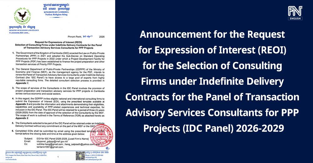 (Phnom Penh): On 30 April 2026, the Government of the Kingdom of Cambodia (GKC) enacted the Law on Public-Private Partnerships (PPP) in 2021 and adopted the Sub-Decree on Standard Operating Procedures for PPP Projects in 2022, under which a Project Development Facility for PPP Projects (PDF) has been established to finance the project preparation and other transaction services of Priority PPP Projects.