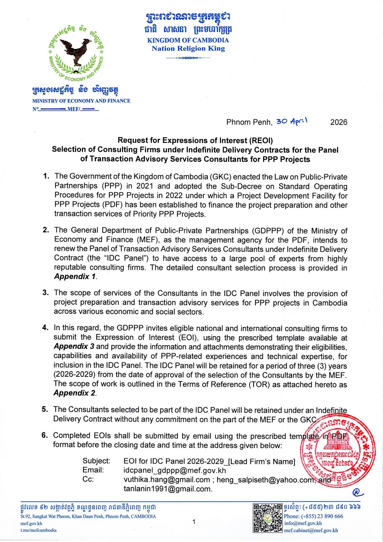 In this regard, the GDPPP invites eligible national and international consulting firms to submit the Expression of Interest (EOI), using the prescribed template available at Appendix 3 and provide the information and attachments demonstrating their eligibilities, capabilities and availability of PPP-related experiences and technical expertise, for inclusion in the IDC Panel. The IDC Panel will be retained for a period of three (3) years (2026-2029) from the date of approval of the selection of the Consultants by the MEF. The scope of work is outlined in the Terms of Reference (TOR) as attached hereto as Appendix 2.