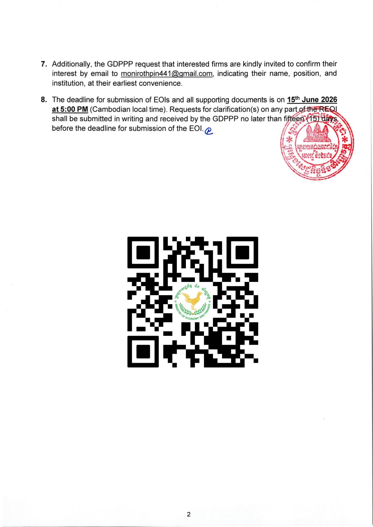 The deadline for submission of EOls and all supporting documents is on 15th June 2026 at 5:00 PM (Cambodian local time). Requests for clarification(s) on any part of the REOI shall be submitted in writing and received by the GDPPP no later than fifteen (15) days before the deadline for submission of the EOI.